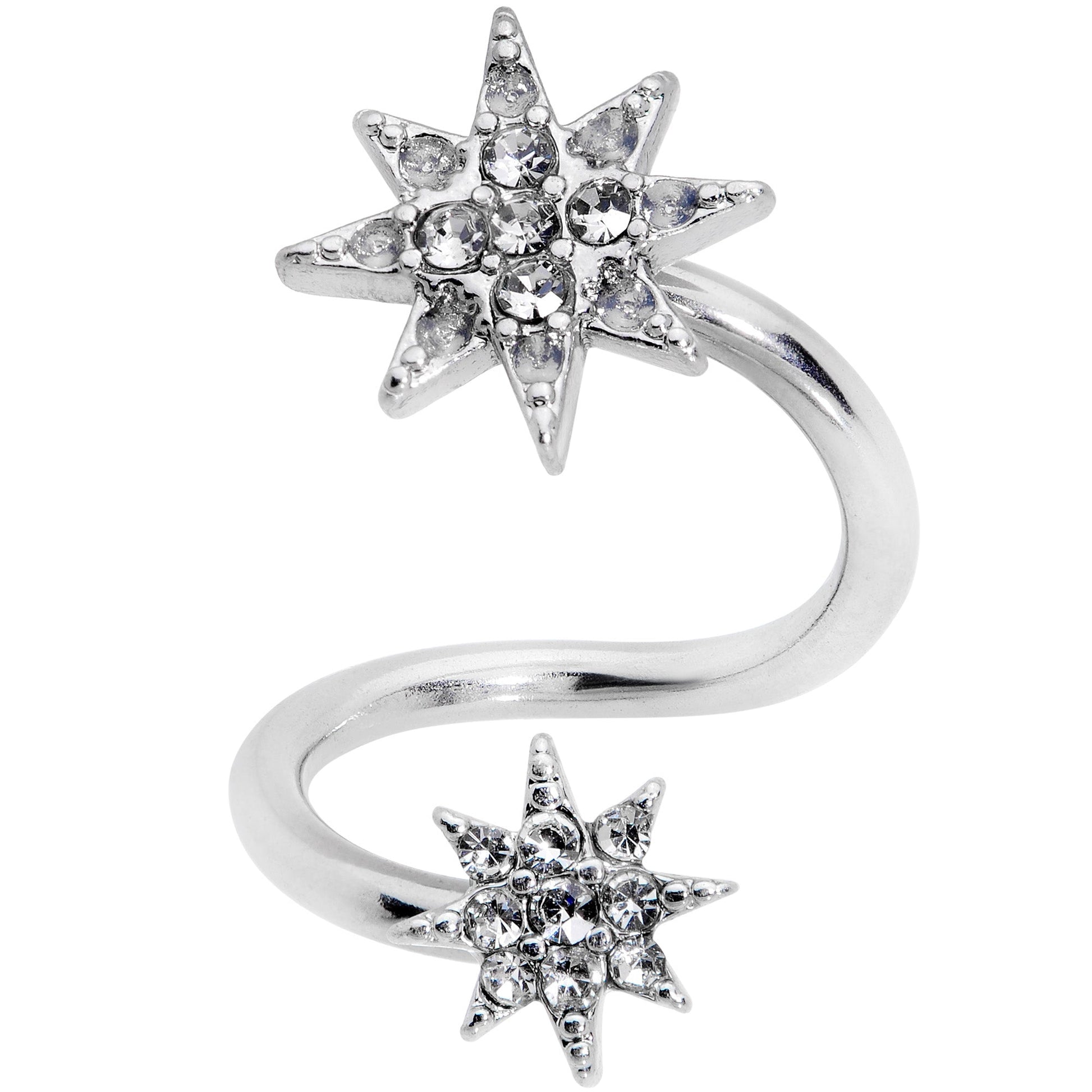 You'll never be lost when you can navigate by these stars! This 14 gauge twister earring is made with a 3/8" durable 316L surgical grade stainless steel spiral curved barbell. The ends feature eight-pointed star charms set with clear gems. Even better, this spiral jewelry works well in multiple piercings including the navel, lip, and eyebrow. You'll never be lost for options with this stunning navel piercing jewelry!Specifications
