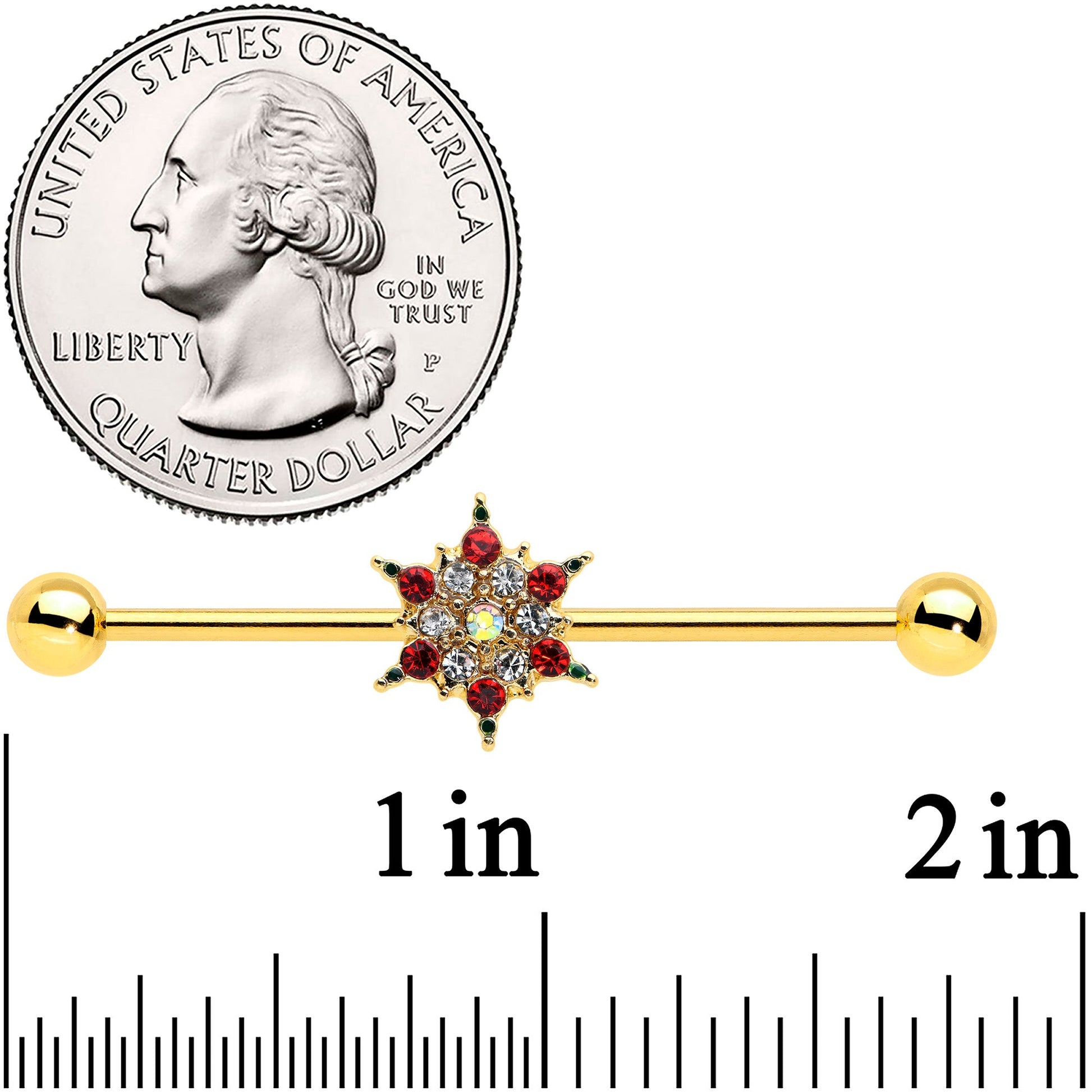 14 Gauge Red Gem Gold Tone Bright Christmas Industrial Barbell 38mm