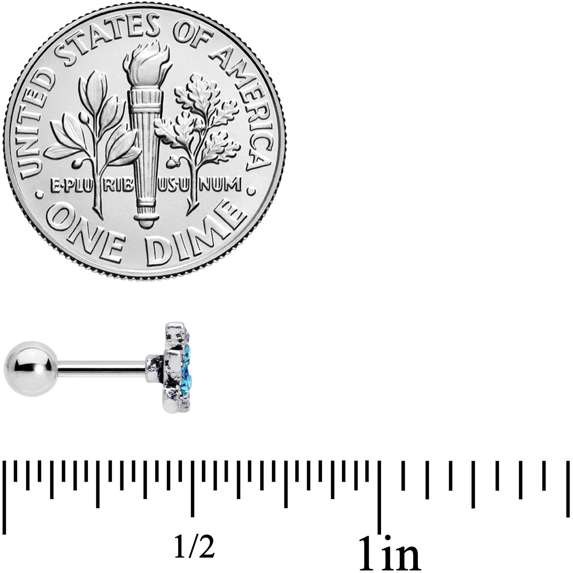 Whether you're under the sea or landlocked, you can be a seaside star with this 16 gauge tragus stud! This tragus earring is made with a 6mm durable 316L surgical grade stainless steel straight barbell with a 4mm ball end and features a starfish charm with aqua gems. It's further embellished with a dark blue gem at its center and clear gems. You can wear this cartilage earring in multiple piercings including your helix, tragus, and some conch piercings. Your cartilage piercing is sure to be a star at sea, on land, and anywhere else you choose to wear this nifty, nautical cartilage stud!Specifications