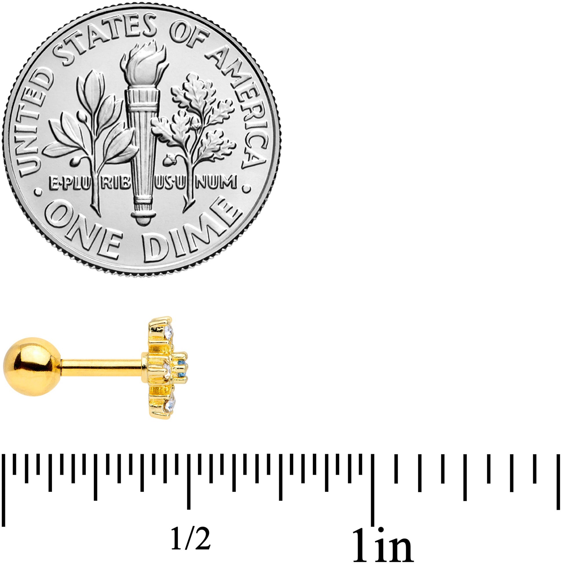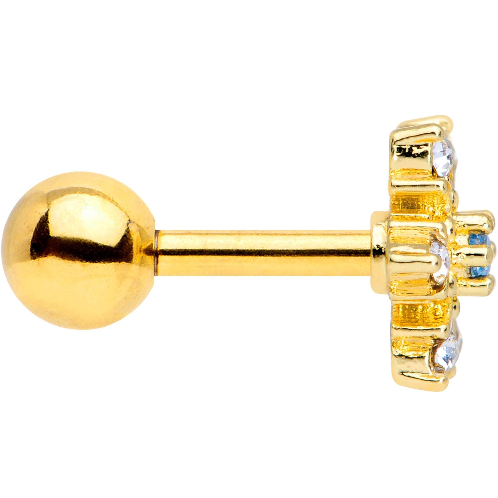 Let it snow all it wants this holiday with this 16 gauge cartilage stud! It's made with a 6mm gold tone PVD over 316L surgical grade stainless steel straight barbell with a 4mm ball end and features a snowflake charm set with clear gems and a blue cubic zirconia gem for a lavish appearance. And you can add some festive flair to multiple piercings including tragus, helix, and some conch piercings. Make cocoa, light a fire, and get cozy - this sumptuous snowflake lets you love winter all year round!Specifications