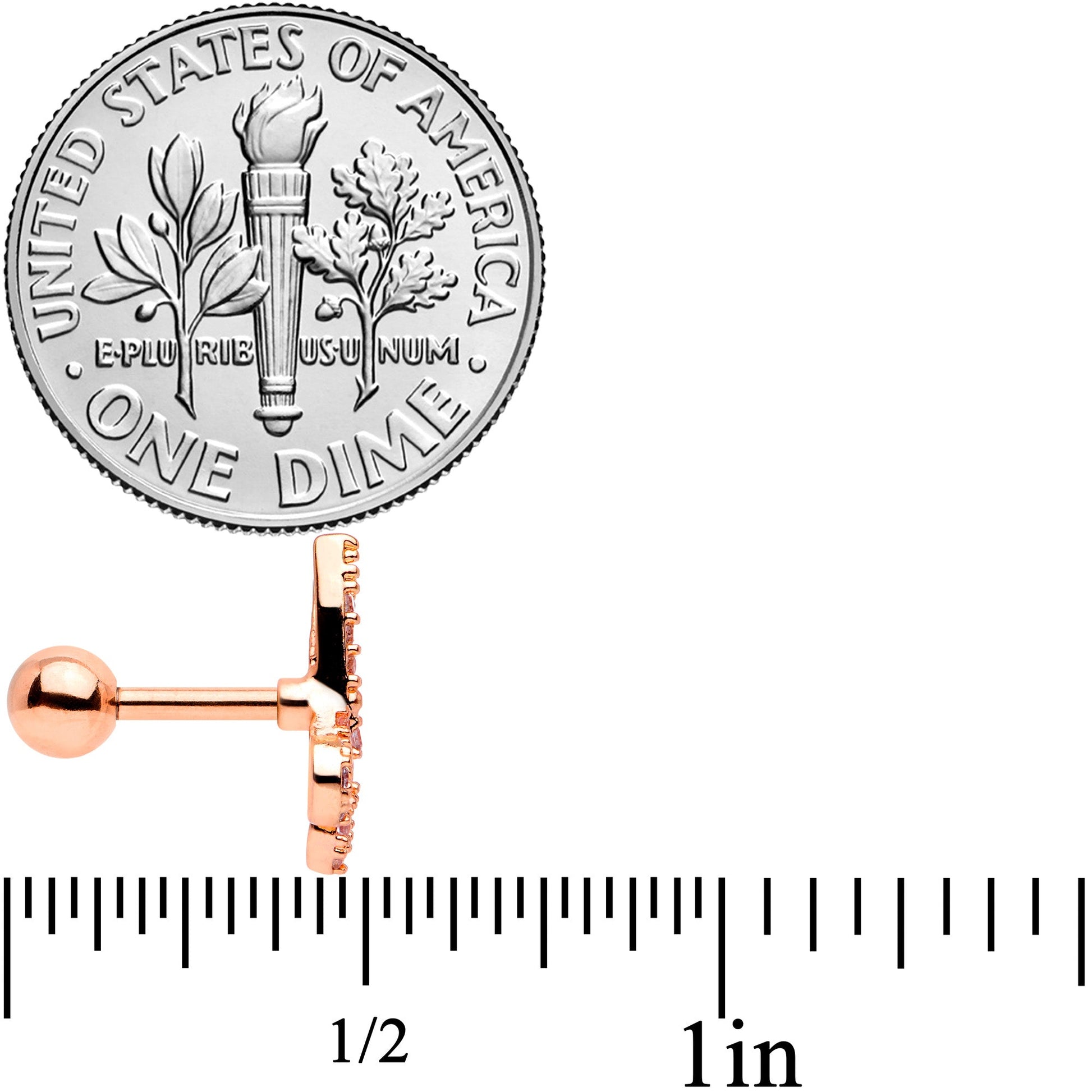 Whether you call them scissors or shears, you'll be calling them gorgeous on this 16 gauge cartilage jewelry! It's made with a 6mm rose gold tone PVD over 316L surgical grade stainless steel straight barbell with a 4mm ball end. It features an open pair of scissors charm paved with clear cubic zirconia gems for a look that screams elegance. And you can show off these shears in multiple piercings including helix, tragus, and some conch piercings. Add a great big snip of glamour to your cartilage piercing with this stunning scissor tragus stud!Specifications