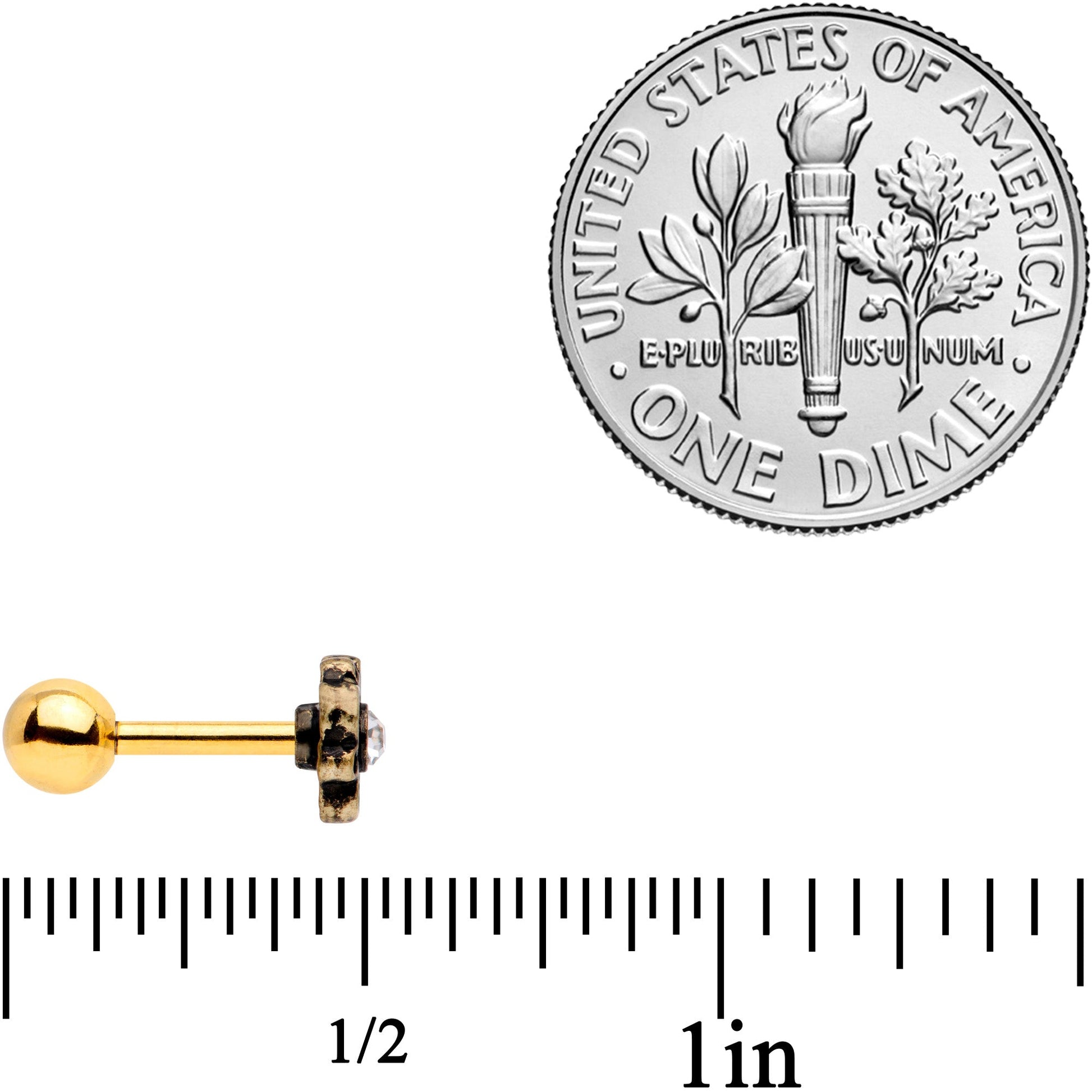 This flower looks like it was taken from an antique coat of arms just to decorate your 16 gauge cartilage piercing! It's made with a 6mm gold tone plated over 316L surgical grade stainless steel straight barbell with a 4mm ball end. It features a flower charm with a clear gem set in the center. Even better, this cartilage stud works beautifully in multiple piercings including the tragus, conch, and helix. Now that's a tragus stud that's got some serious flower power!Specifications