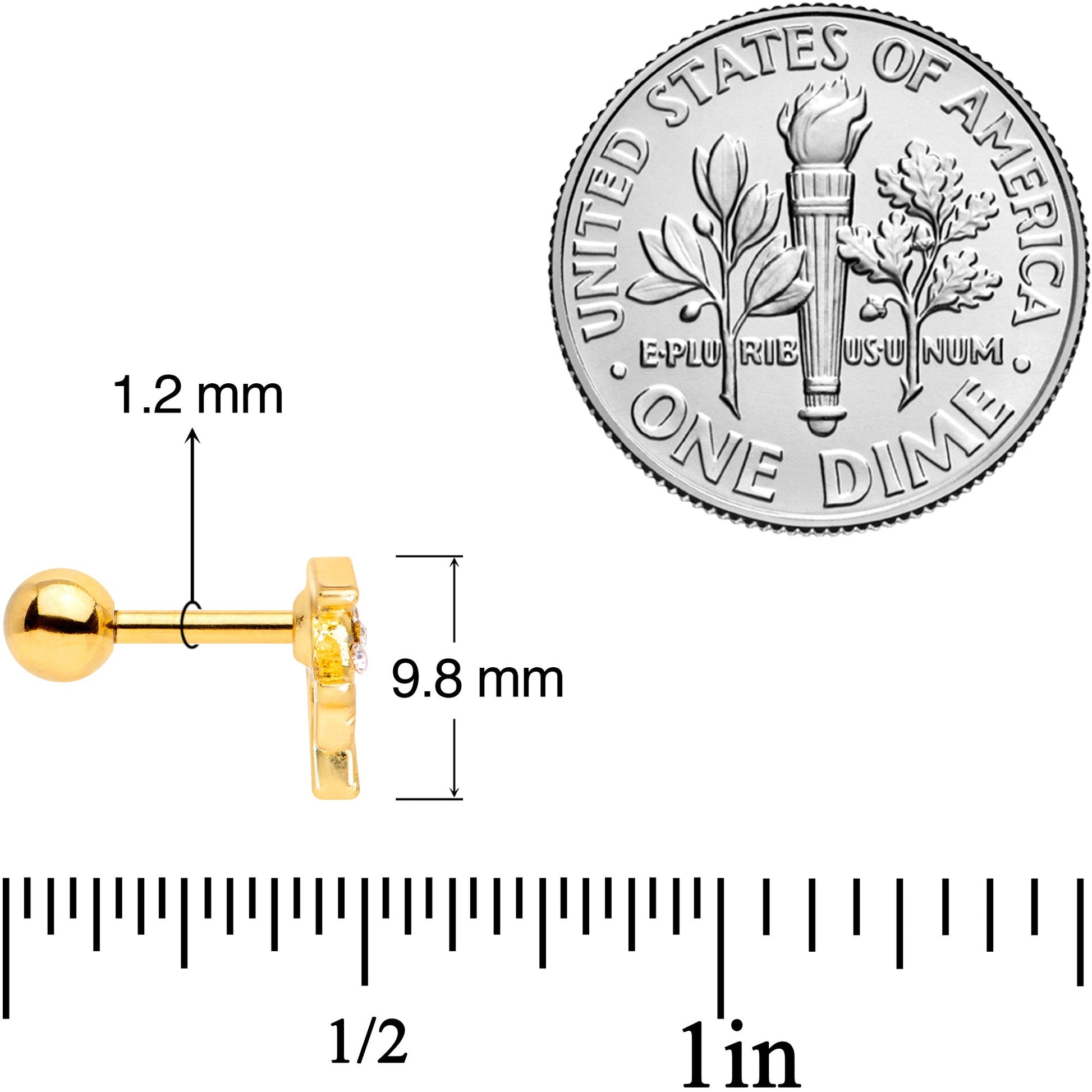 This little birdy is heading home to roost...and what a variety of homes it has to choose from! This 16 gauge cartilage stud is made with a 6mm gold tone PVD over 316L surgical grade stainless steel straight barbell with a 3mm ball end. It features a small bird charm set with clear gems for a clean and stylish appearance. This little bird tragus stud can roost in a number of piercings including the tragus, helix, conch, and other cartilage piercings! You'll love having this little bird to whisper in your ear!Specifications