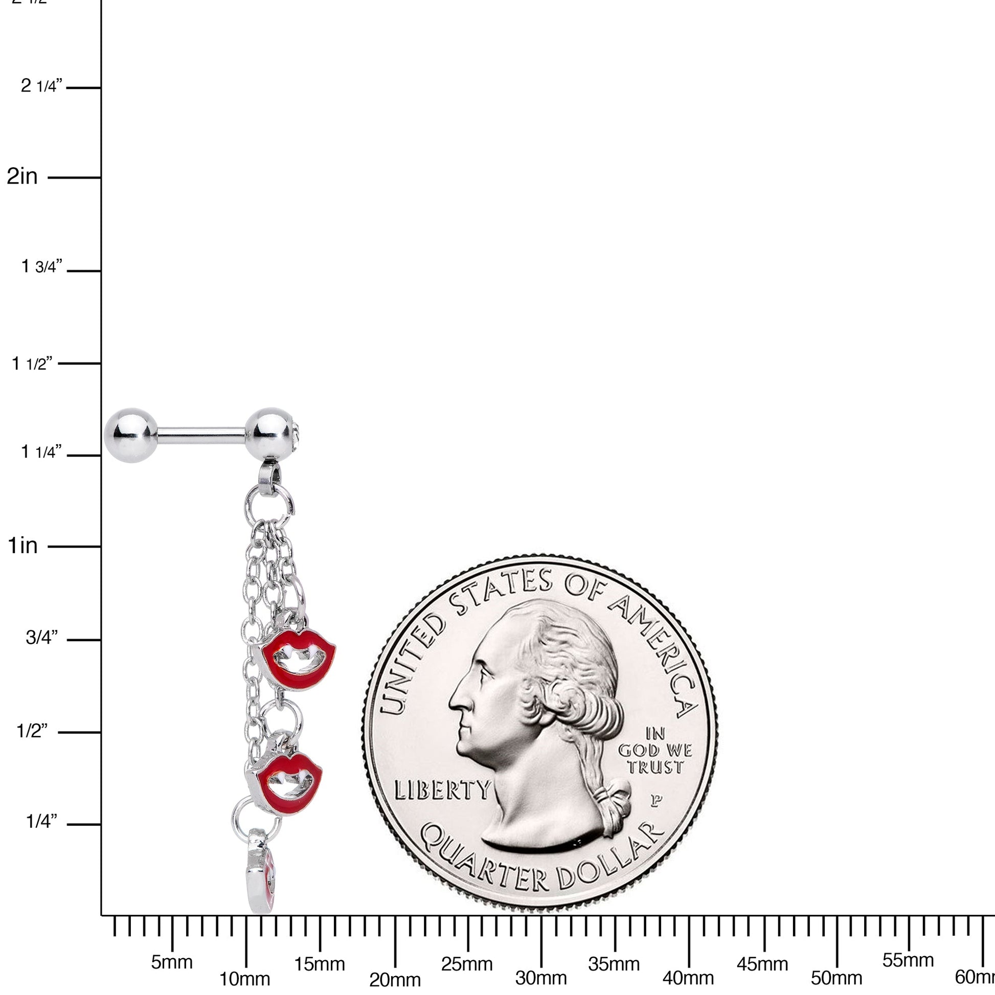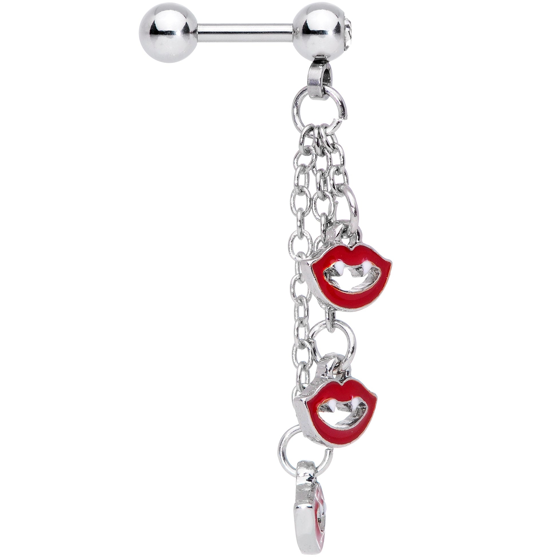 This Halloween, take a bite out of style with this 16 gauge cartilage jewelry! It's made with a 6mm durable 316L surgical grade stainless steel straight barbell with 4mm ball ends. The front ball end is set with a small clear gem. Dangling beneath it is a trio of matching black chains, each with a fanged mouth charm at the end. And you can rock these fangs in multiple piercings including tragus, helix, and some conch piercings. Vamp up your look with this sexy, scary, vampire-themed cartilage stud!Specifications