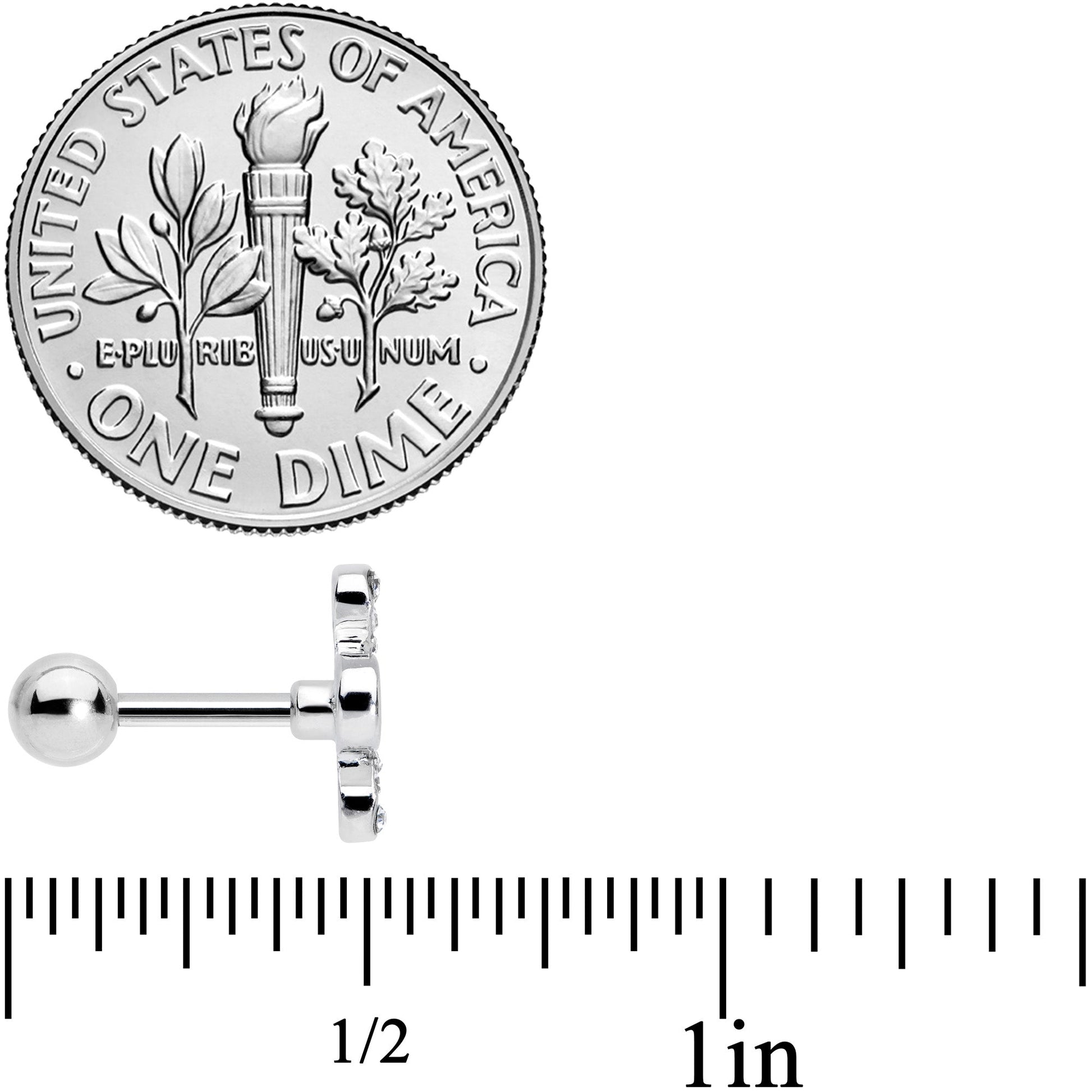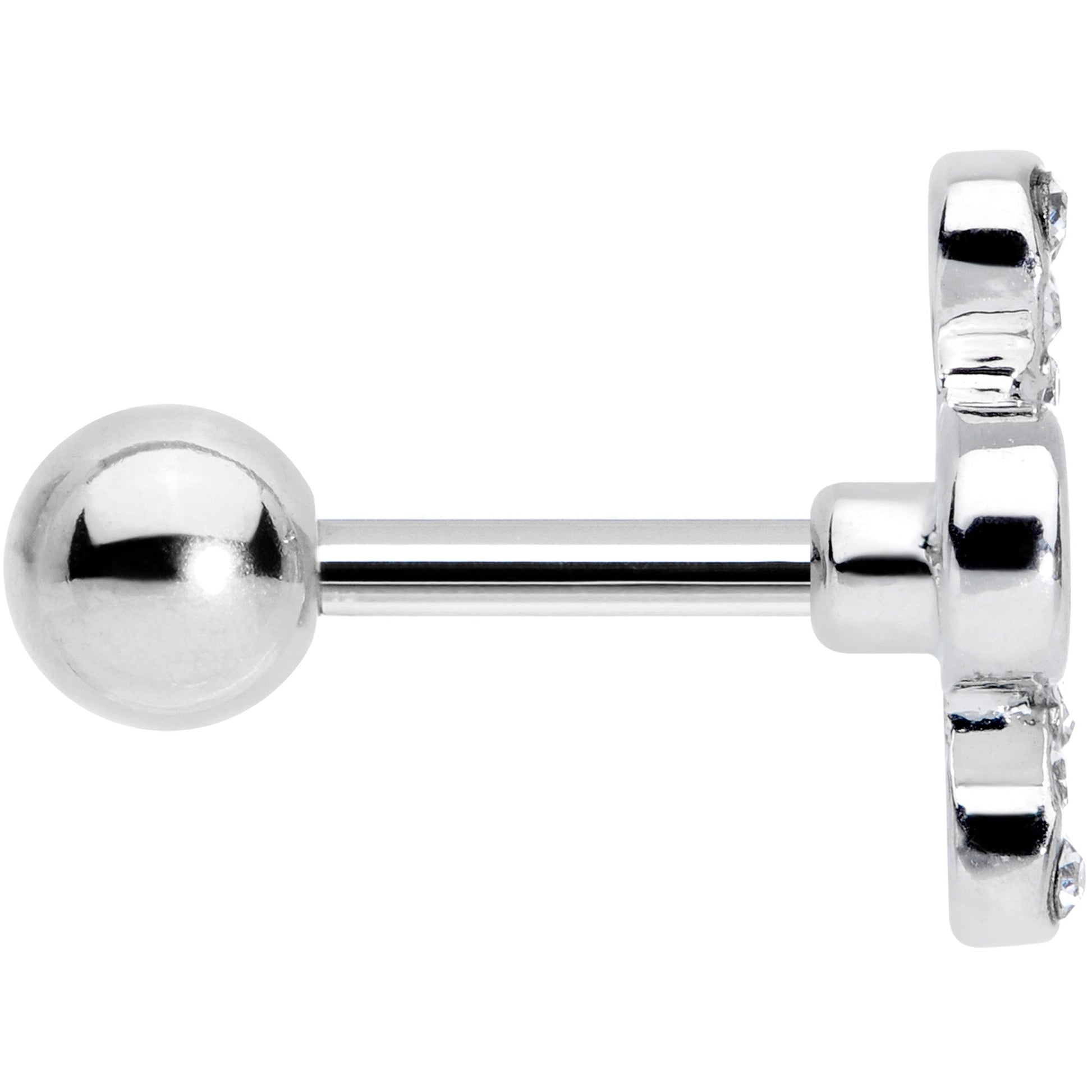 If your love of all things Irish is infinite then show it off with this 16 gauge tragus stud! It's made with a 6mm durable 316L surgical grade stainless steel straight barbell with a 4mm ball end and features a shamrock charm with the top and bottom leaves shaped like hearts and paved with small clear gems. The side leaves curve around like a figure eight to form the symbol for infinity. You can wear this cartilage stud in multiple piercings including tragus, helix, and some conch piercings. The overall look is both opulent and airy and absolutely perfect for celebrating St Patrick's Day!Specifications