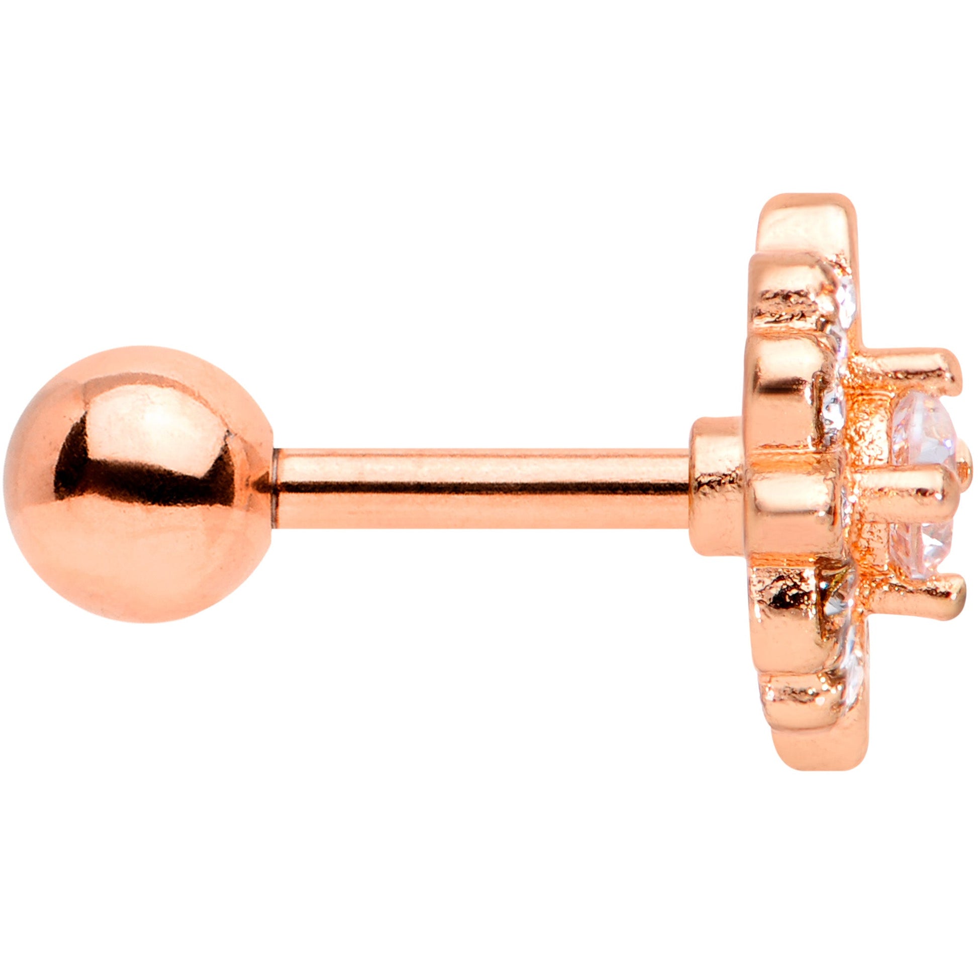 Wear your spirituality with pride when it looks as lovely as this 16 gauge cartilage stud! It's made with a 6mm rose gold PVD over 316L surgical grade stainless steel straight barbell with a 3mm ball end. It features a Celtic cross-inspired charm with a large clear gem at the center. The design on the charm is oval-shaped and set with clear gems, matching the ring that surrounds it which is also set with clear gems. This tragus stud will work well in multiple cartilage piercings including the helix, tragus, conch, and more.Specifications