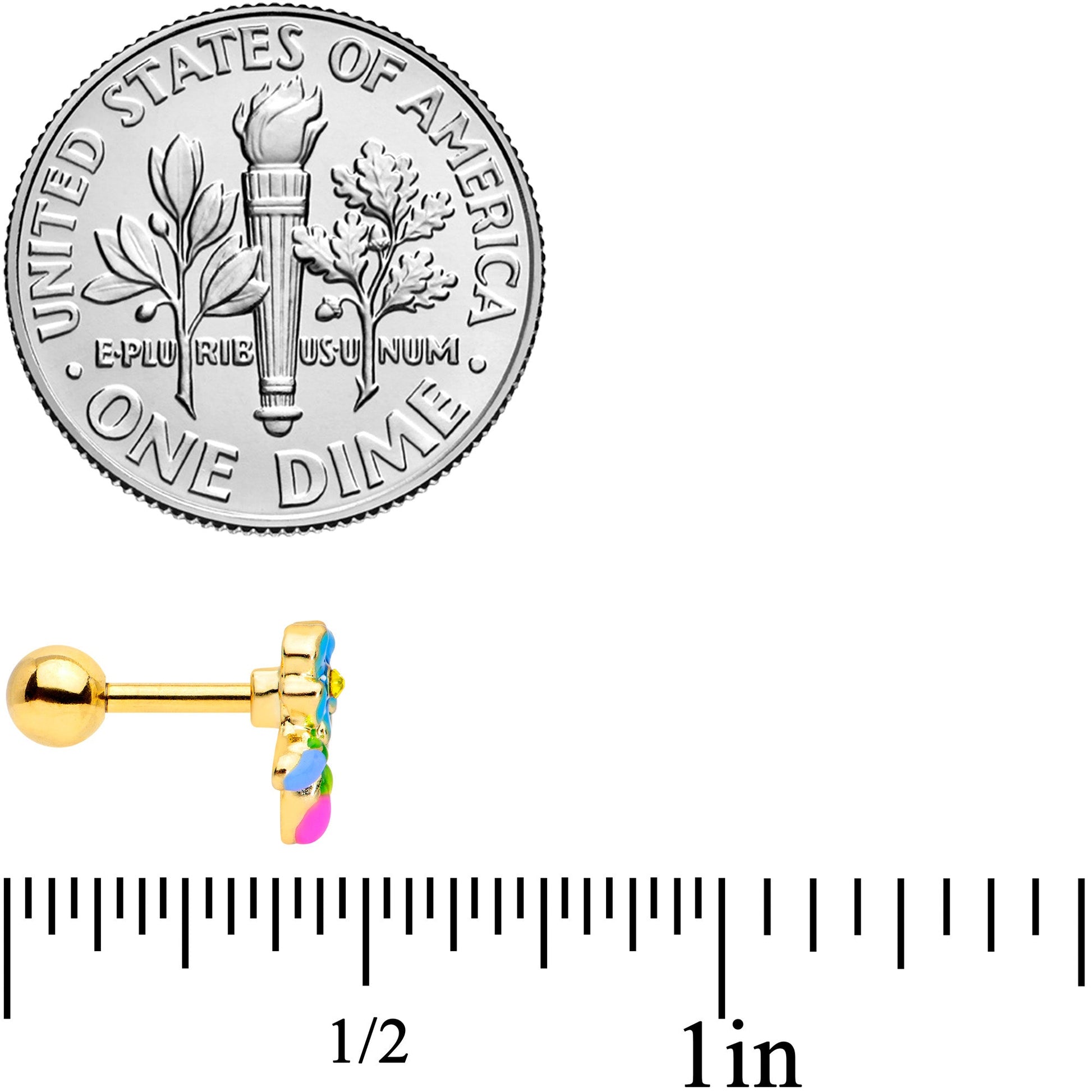 Brighten up your day with the bright colors of this 16 gauge cartilage stud! It's made with a 6mm gold tone PVD over 316L surgical grade stainless steel straight barbell with a 4mm ball end and features a flower charm with bright aqua petals and a yellow gem set at its center. The flower also has a green leaf and is further embellished with a pair of buds underneath in intense lavender and knock-your-socks-off hot pink! This flower tragus earring can add color to multiple piercings including tragus, helix, and some conch piercings. If you're searching for a way to add color and style to your cartilage piercings, grab your garden shears and pick a pair of neon posies with the concentrated colors of this floral cartilage stud!Specifications