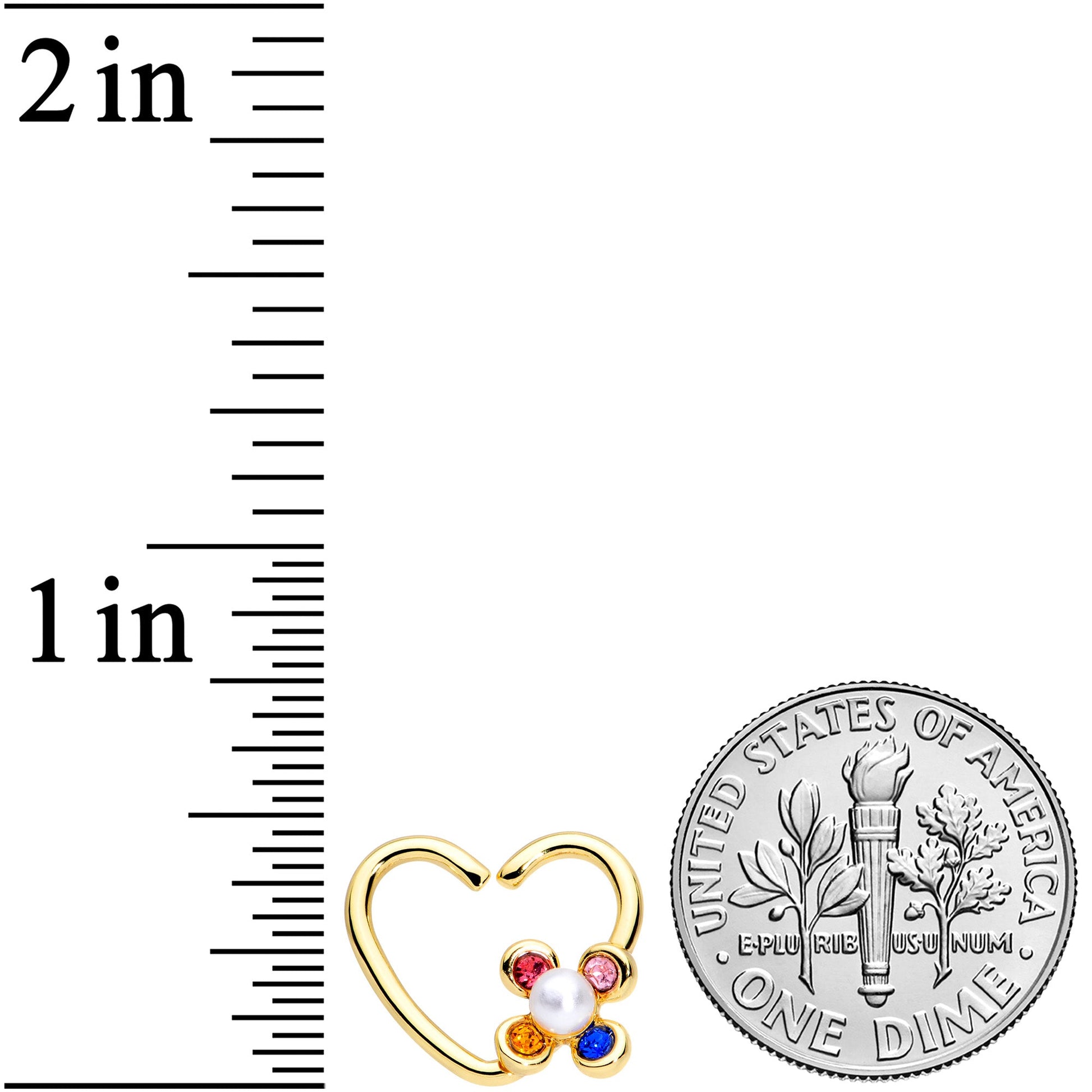 Put a little flower power in your cartilage piercing this Valentine's Day with this right side 16 gauge closure ring! It's 10mm and made with gold tone PVD over 316L surgical grade stainless steel. This heart-shaped jewelry features a flower charm composed entirely of gems, with each petal a different color. There's one petal each in light pink, deep blue, golden yellow, and hot fuschia pink. At the center, the flower is further embellished with a white pearlescent orb. It's super easy to insert and remove - simply twist the ring open, insert, and then twist gently shut again. This cartilage jewelry works well in multiple piercings including your helix, tragus, daith, rook, and more.Specifications