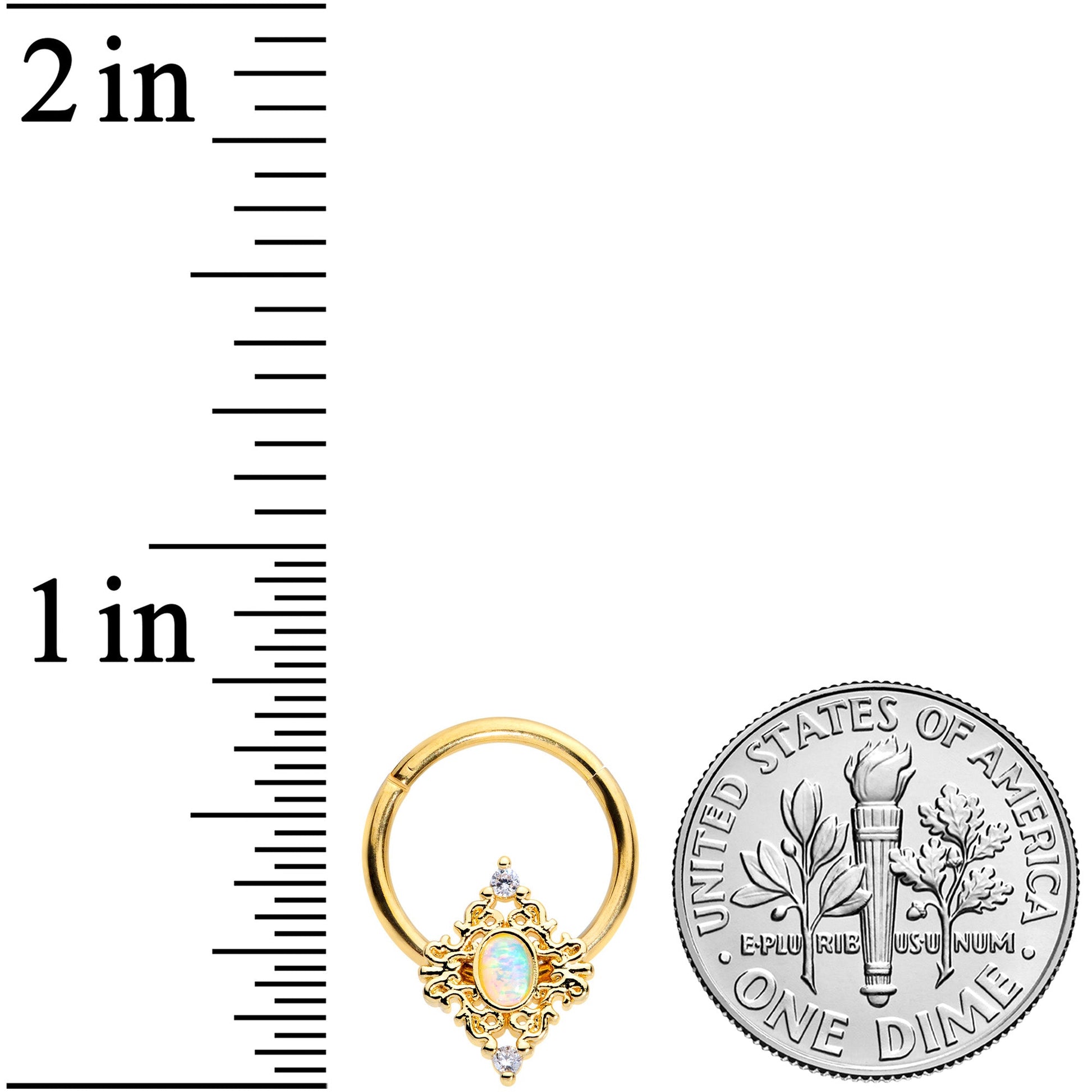 Oh, that oval.... it'll put your cartilage piercing over the top with this 16 gauge cartilage ring! It's made with a 10mm gold tone PVD over 316L surgical grade stainless steel hinged circular ring. It features a heavily textured rhombus-shaped charm with tiny clear cubic zirconia gems set at the top and bottom points. The charm is further embellished with an oval white synthetic opal set at the center for a look that's super ornate and totally on-trend. Even better, it features a hinged, non-removable segment that makes insertion and removal a breeze. You'll love that feature because you can wear this oval in multiple piercings including your septum as well as cartilage piercings like the helix, tragus, rook, and daith. This oval is sure to have you over the moon with love!Specifications