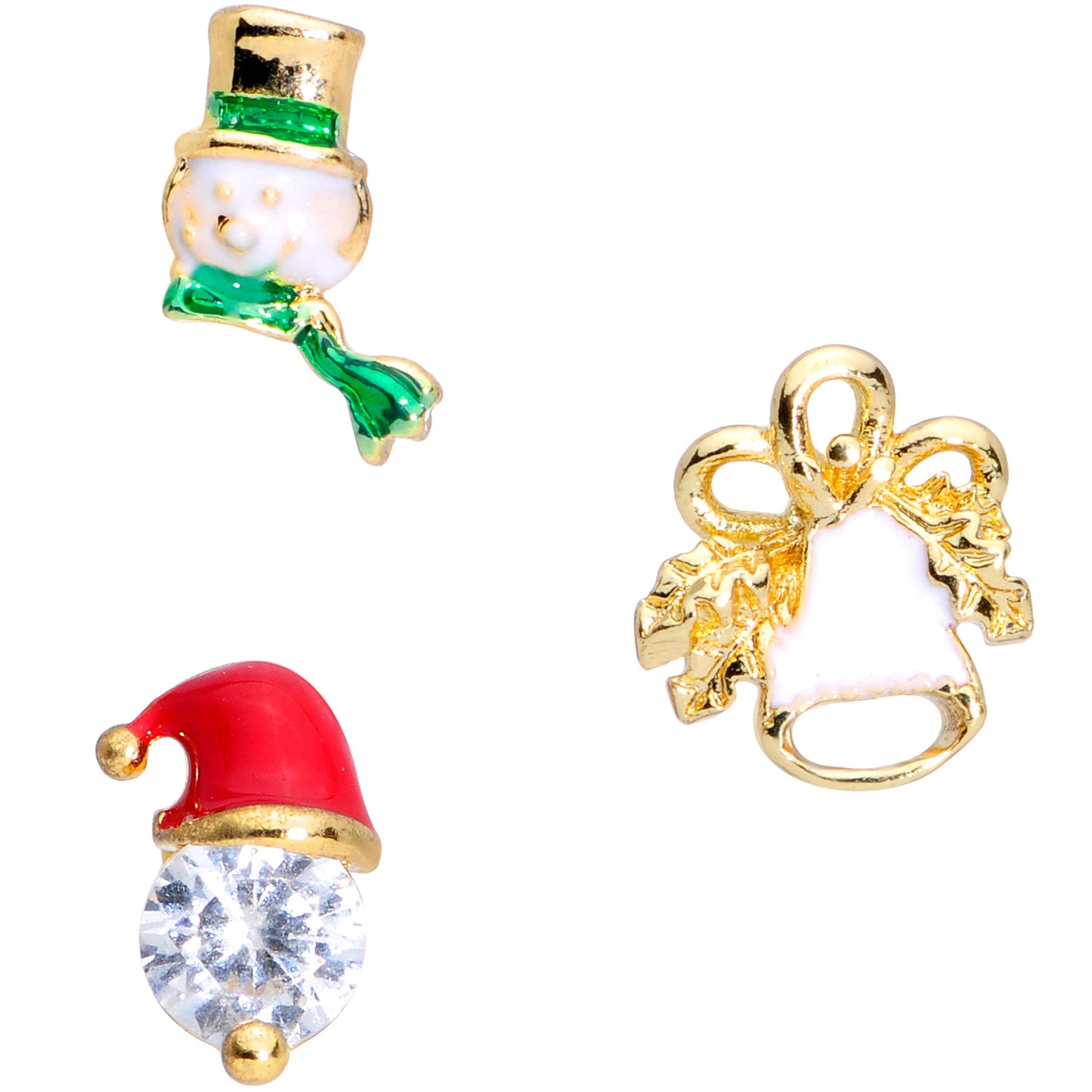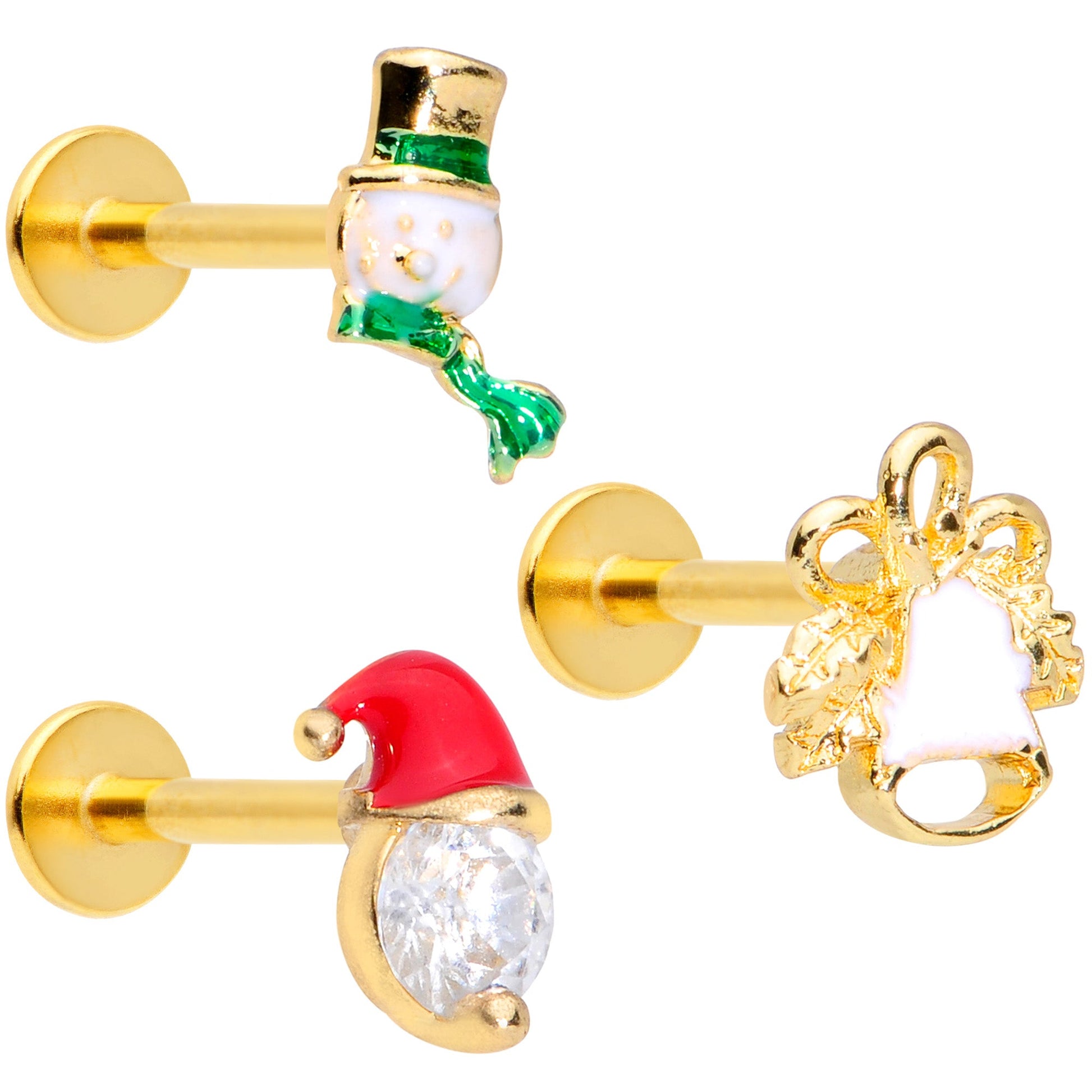 If If you haven't caught the holiday spirit, this set of 16 gauge cartilage jewelry should definitely bring it your way! They're made with 8mm gold tone PVD over 316L surgical grade stainless steel straight posts with flat disc ends. You get one tragus earring that features a white bell charm. The second one features a snowman charm wearing a top hat and green scarf for an elegant color combination. The third labret features a single clear gem with a red Santa hat charm. Best of all you can wear these in multiple piercings including lip, monroe, and some cartilage pircings like the helix, tragus, and conch piercings. Bring the holidays to your cartilage piercings with this festive set of lip rings! Sold as a set of three.
