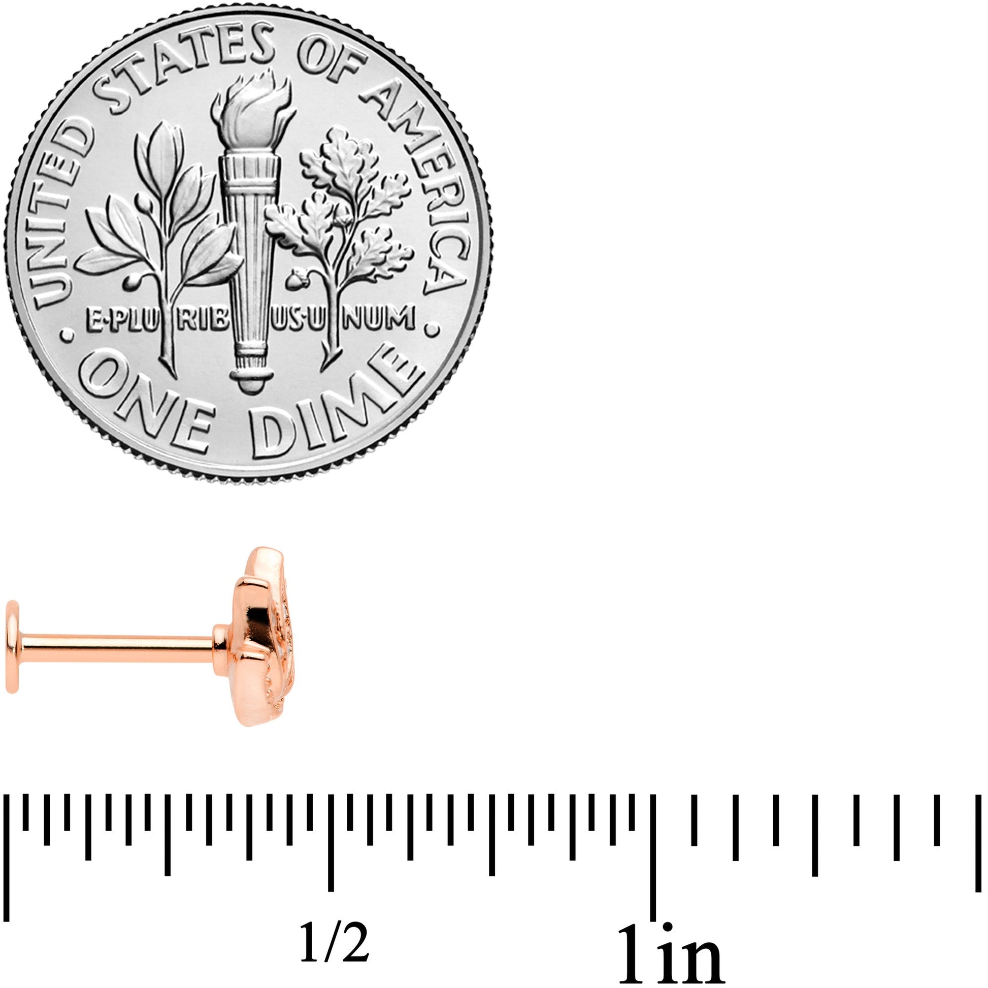 This 16 gauge lip ring may not help you find inner peace, but it will help you look darn good while you search! It's made with an 8mm rose gold tone plated over 316L surgical grade stainless steel straight barbell with a flat disc end. It features a lotus flower charm with clear gems that works well in multiple piercings including cartilage piercings like the lip, monroe, tragus, and conch. Let this lovely lotus bloom all over your cartilage - such beauty can't help but make you feel a bit more peaceful!Specifications