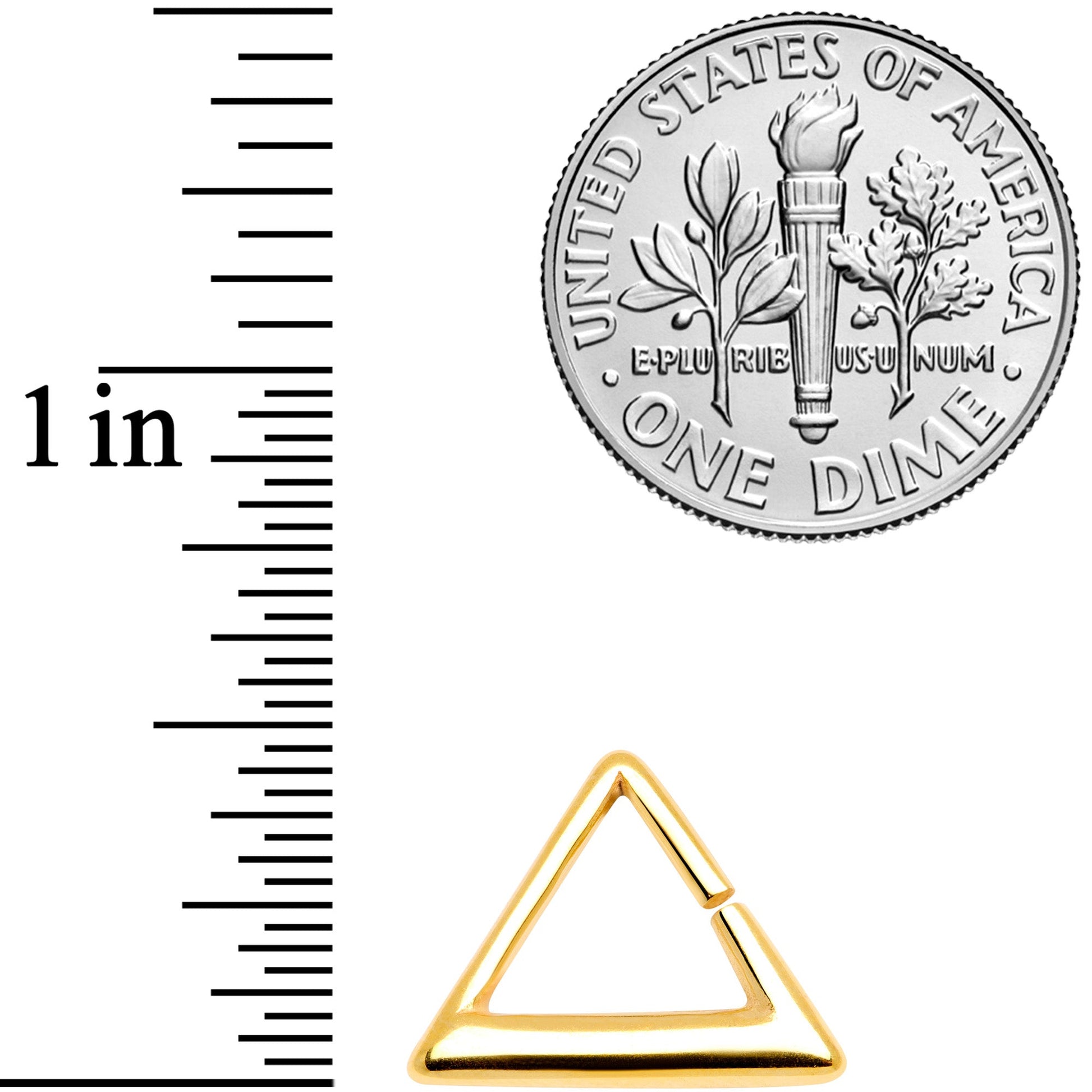 No matter how you try, you can't find cartilage jewelry with more elegant simplicity than this 16 gauge triangle! It's 8mm and made with gold tone PVD over 316L surgical grade stainless steel. This type of universal ring is super easy to insert and remove - simply twist the ring open, insert, and then twist gently shut again. And you'll love that feature because they work so well in multiple piercings including cartilage piercings like the tragus, helix, and more. That's quite an angle!Specifications