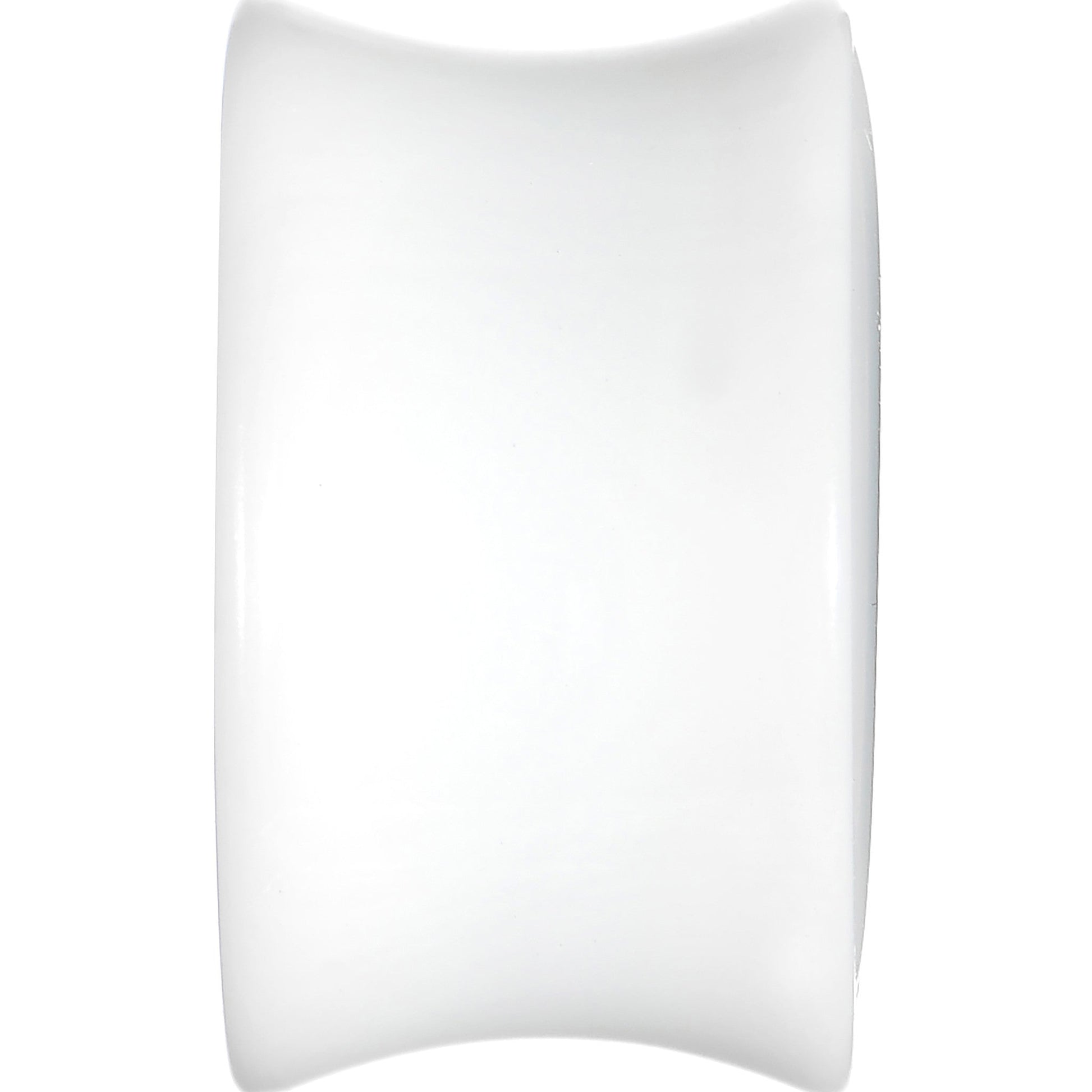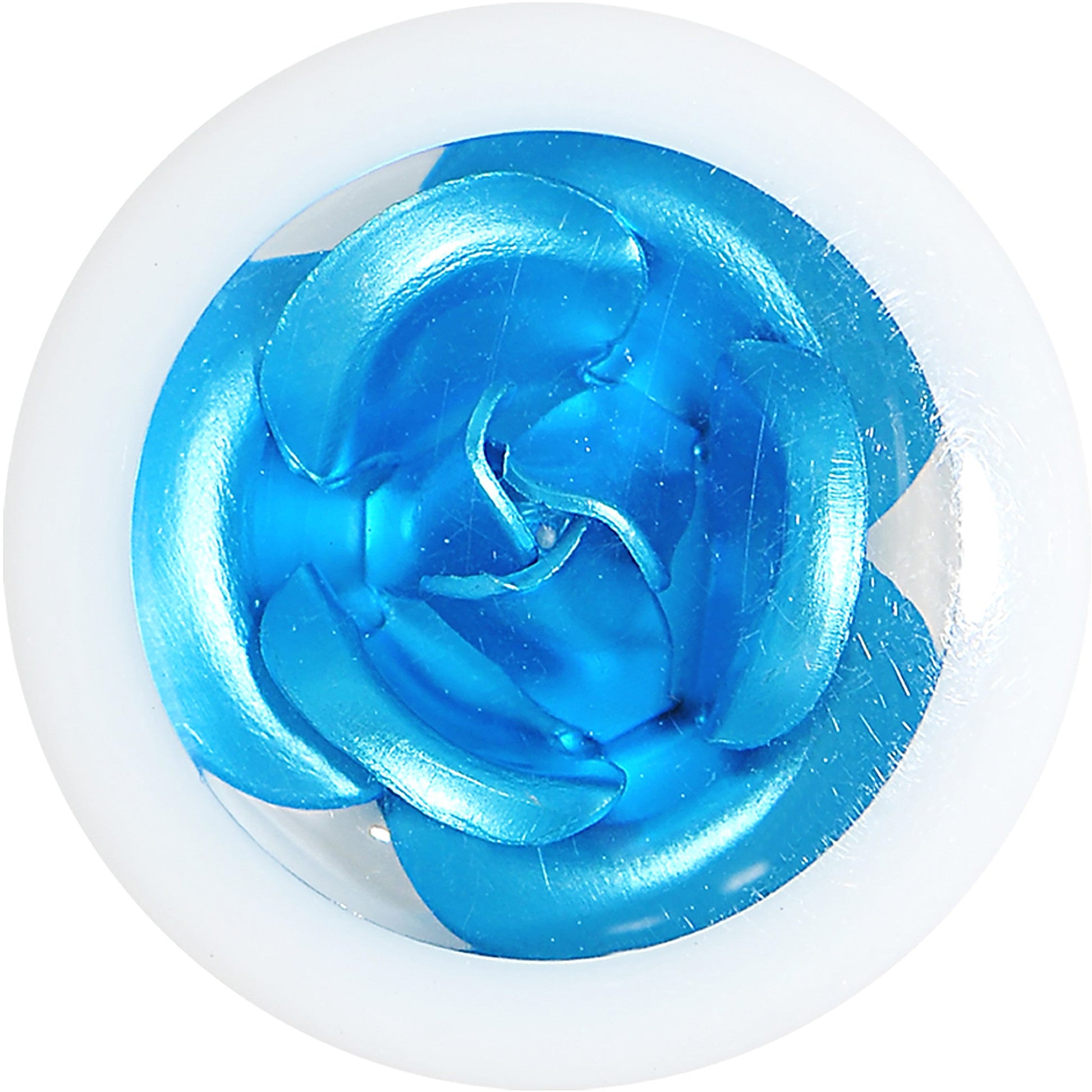 Sold Individually, purchase 2 for a pair. 5/8" white acrylic plug featuring a floating aqua blue metallic rose. Let your beauty bloom with this elegant floral ear plug.