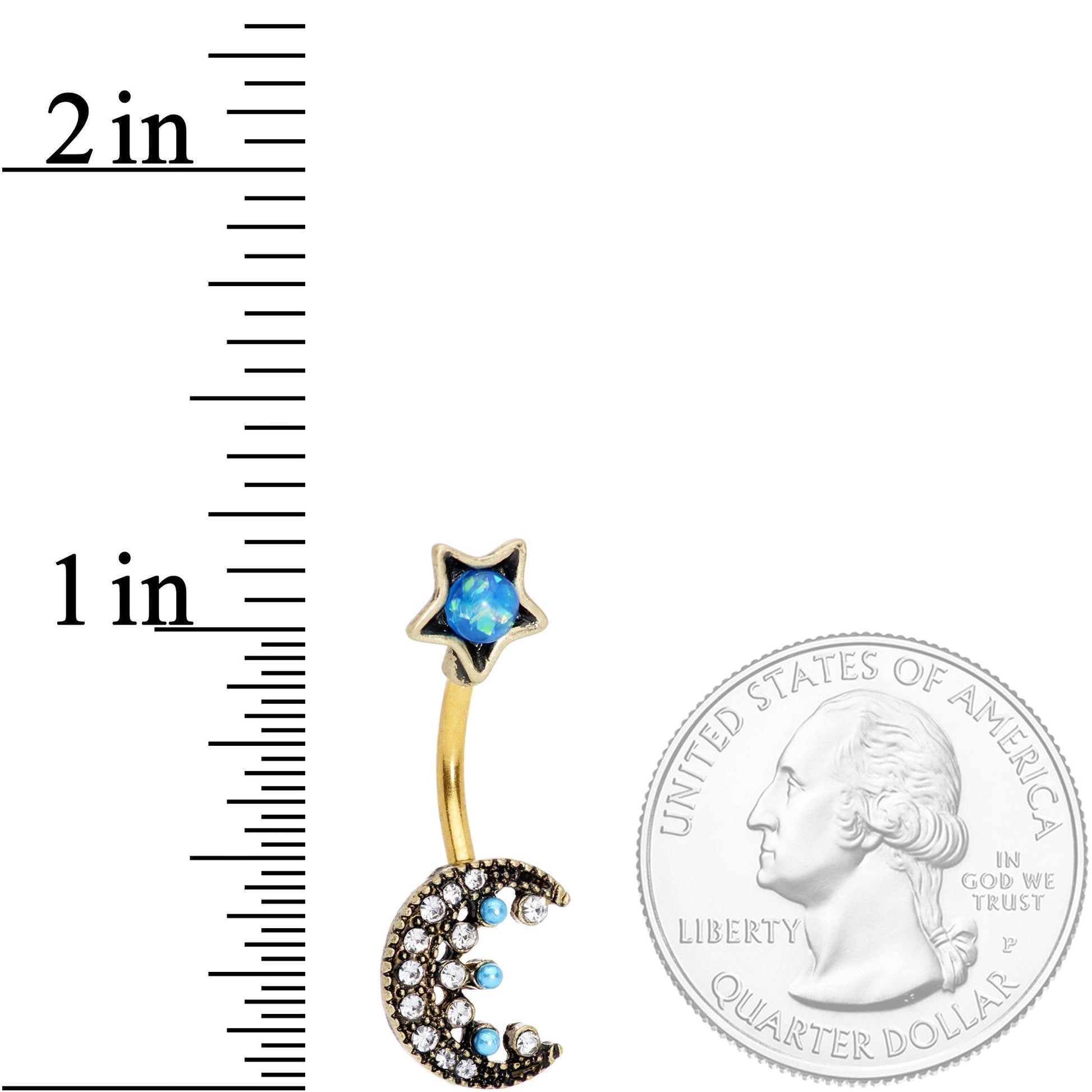 If you love wearing your body jewelry in a variety of ways then this reversible 14 gauge navel ring is right for you. Made with a 3/8" gold tone plated over 316L surgical grade stainless steel curved barbell, this navel piercing features a star top charm with an aqua faux opal as well as a crescent moon bottom charm set with blue orbs and clear accents. Turn the navel jewelry over and wear it upside down if it suits you!