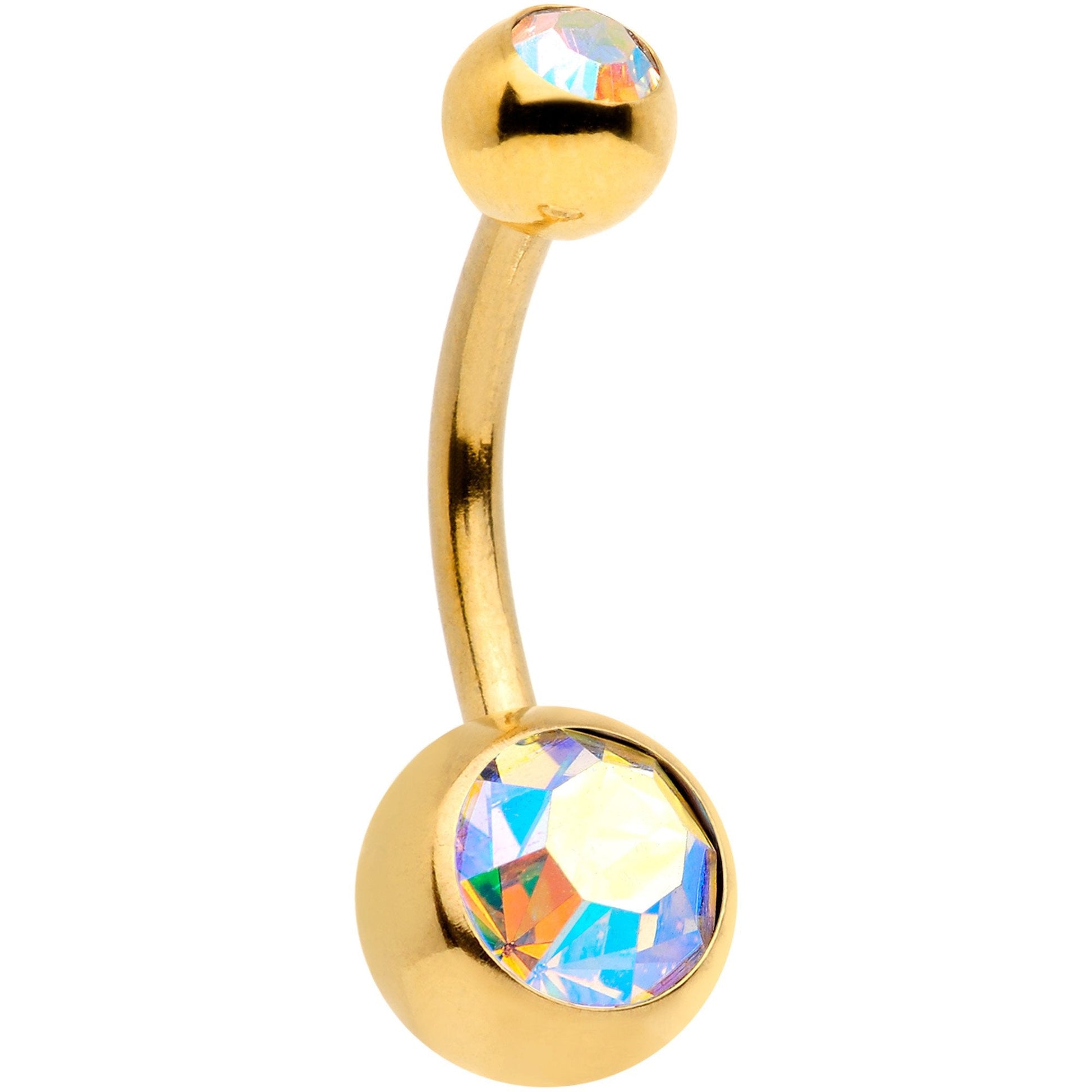 This set of 14 gauge navel rings gives you a whole range of looks in one set! One is made with a 7/16" durable 316L surgical grade stainless steel curved barbell and the others are made with gold tone anodized over 316L surgical grade stainless steel curved barbells. The first one has a 5mm top ball end and an 8mm bottom ball end, each set with an aurora gem for a look that is both clean and colorful. The second one has a pink confetti style 5mm top ball and matching 8mm bottom ball end. The third one has a plain 5mm top ball end and an 8mm bottom ball end set with a large aurora gem. Dangling from the bottom is a charm of folded angel's wings, with each feather clearly detailed, and set with small aurora gems for a cohesive feel. You'll be thanking the heavens for these belly button rings! Sold as a set of three.