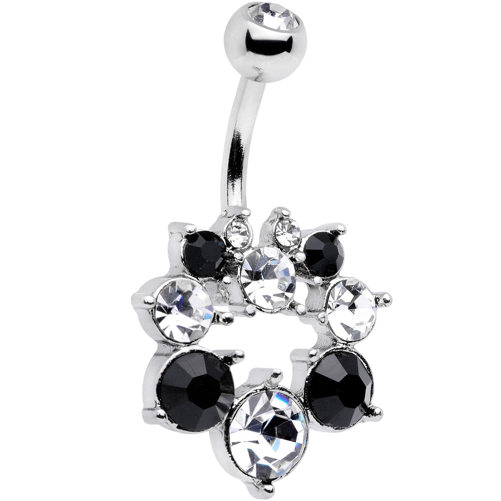 This belly button piercing is just bursting with sparkling gems! Gems in two colors, black and clear, are arranged in a beautiful halo design on this unique 14 gauge belly button piercing. The gem halo is mounted on a 7/16" in length curved barbell made with durable 316L surgical grade stainless steel and complete with a top ball aurora gem for that extra bit of sparkleSpecifications