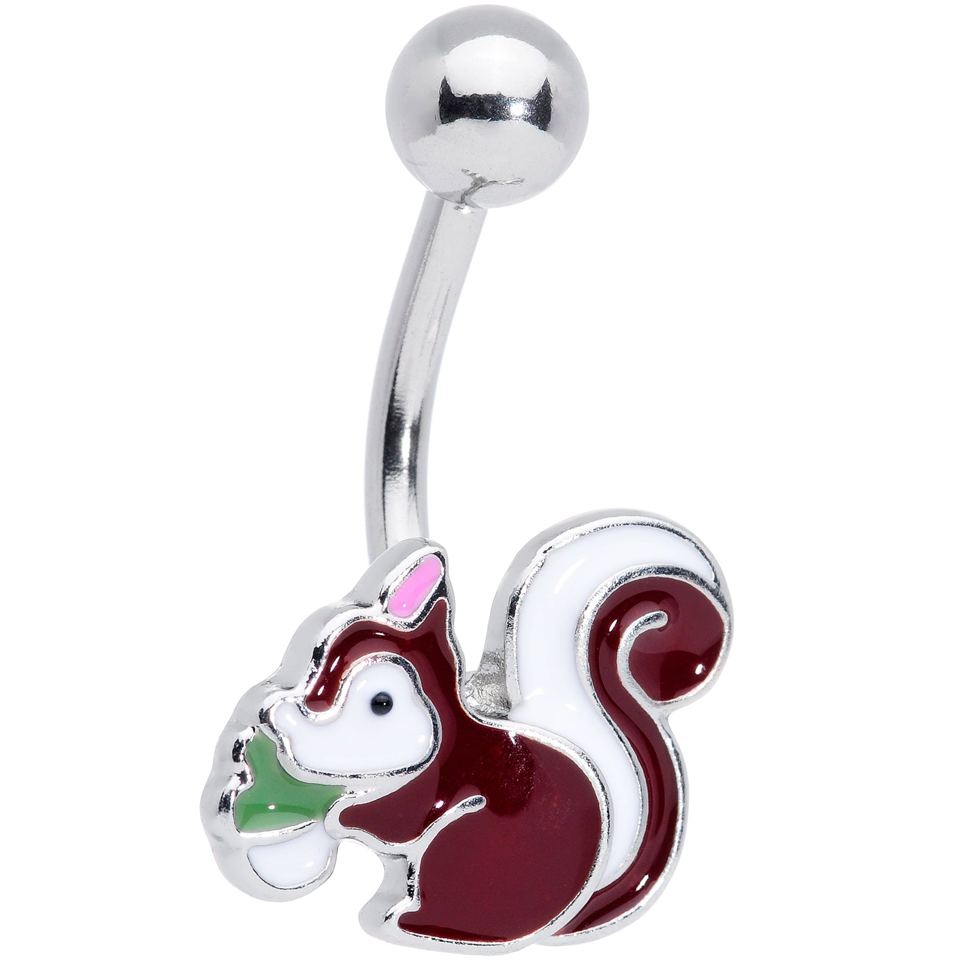 Nom, nom, nom......it's always snack time with this 14 gauge navel jewelry! It's made with a 3/8" durable 316L surgical grade stainless steel curved barbell with a 5mm top ball end. The bottom end features a sweet little squirrel charm who is just about to have a bite to eat. It's hanging onto a tiny acorn! This sweetly whimsical belly button ring is sure to bring out the animal in you...or at least the animal lover!Specifications