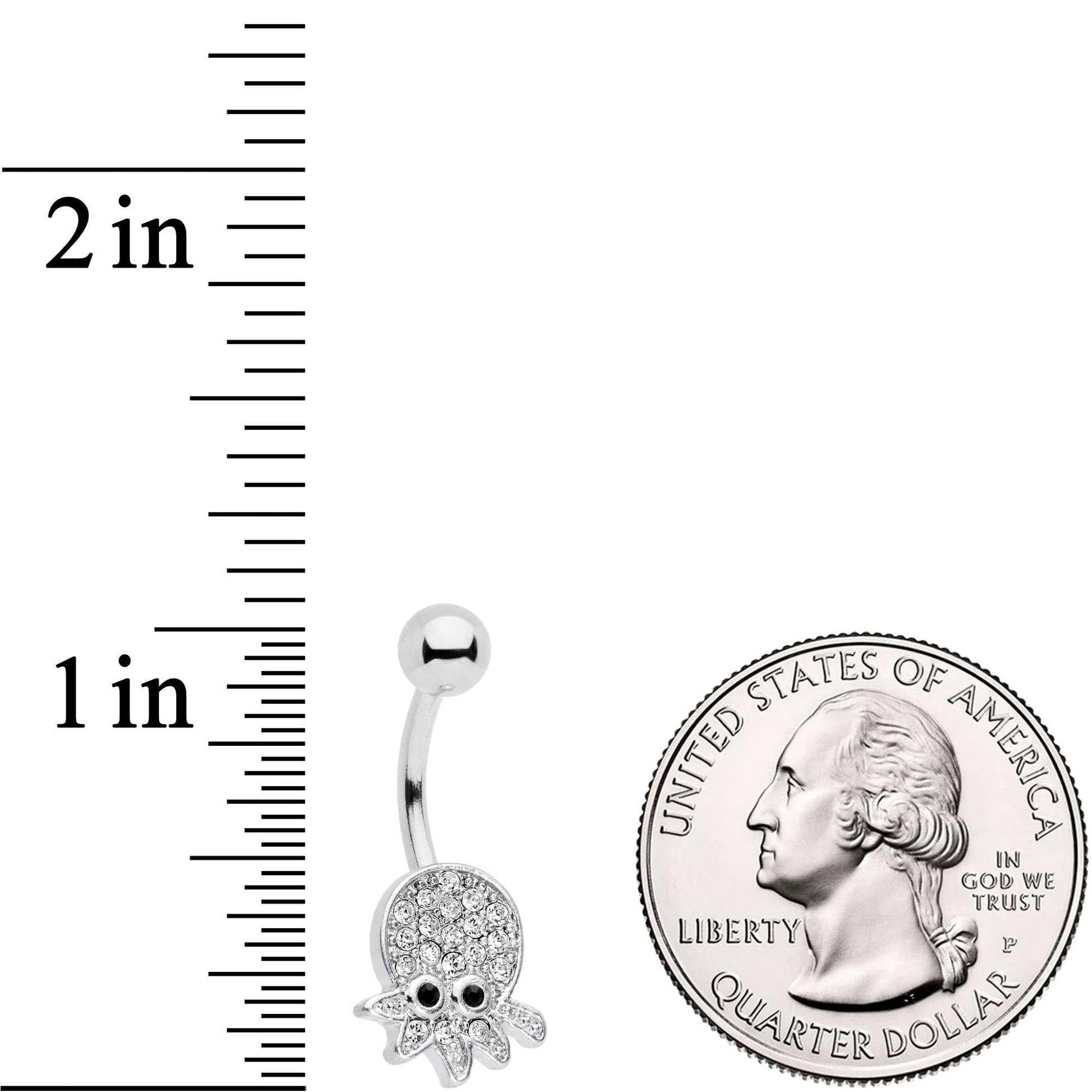 Yar, matey! Set sail for glamour with this 14 gauge octopus navel ring! It's made with a 3/8" durable 316L surgical grade stainless steel curved barbell with a 5mm top ball end and features an octopus charm with a clear gem body and black gems for eyes. So raise the anchor - we're heading for nautical grandeur in your navel piercing!Specifications