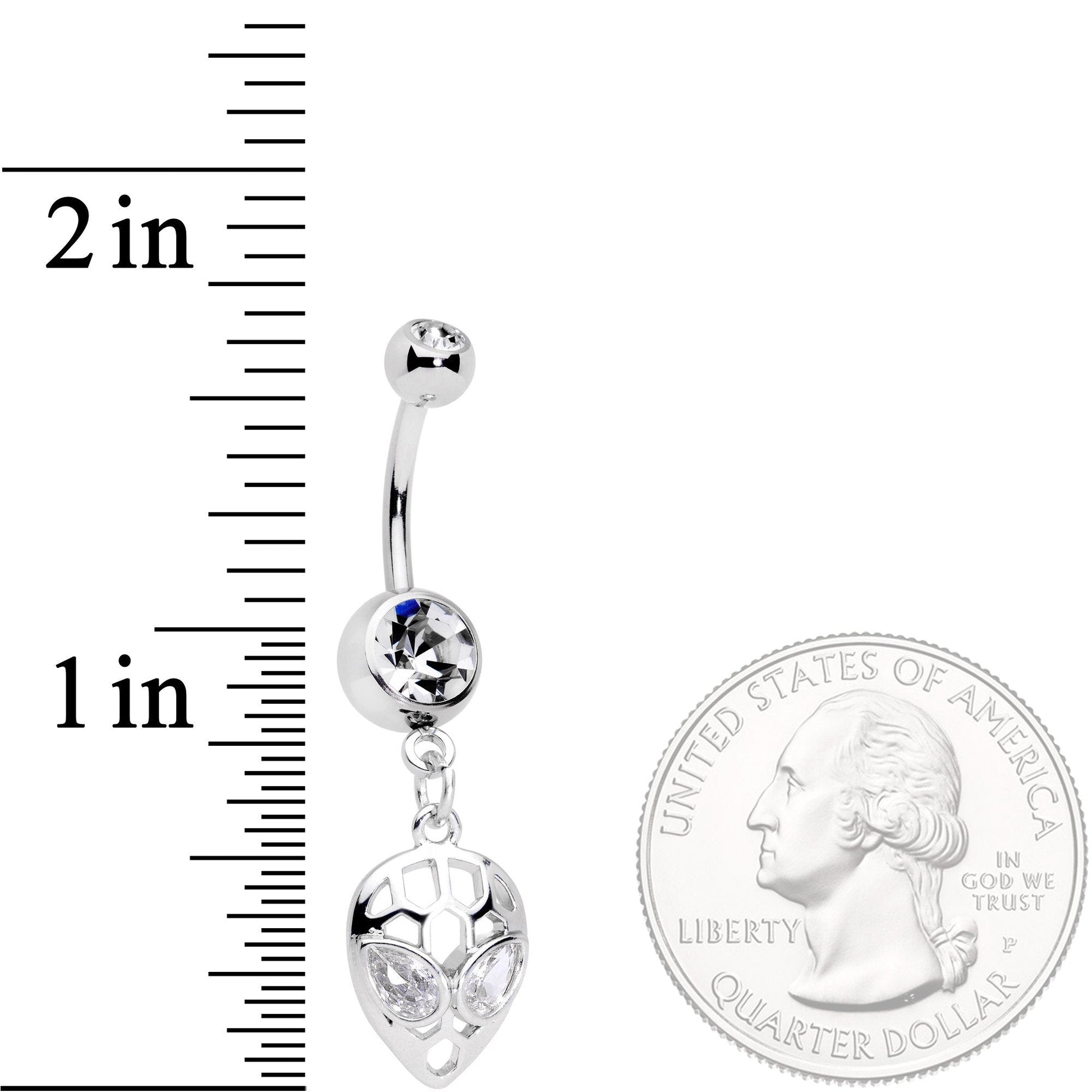 This little alien must be awfully impressed by life here on Earth! He's positively wide-eyed! This 14 gauge belly button ring is made with a 3/8" durable 316L surgical grade stainless steel curved barbell. It features a 5mm top ball end and an 8mm bottom ball end, each set with a clear gem. Dangling from the bottom is a charm of an alien's face whose eyes are made of clear cubic zirconia gems. With this delicate-appearing style and wide-eyed gaze clearly featured, obviously these aliens want to enjoy everything life on Earth has to offer. So pop them in your piercings - how's that for inter-planetary cooperation?Specifications