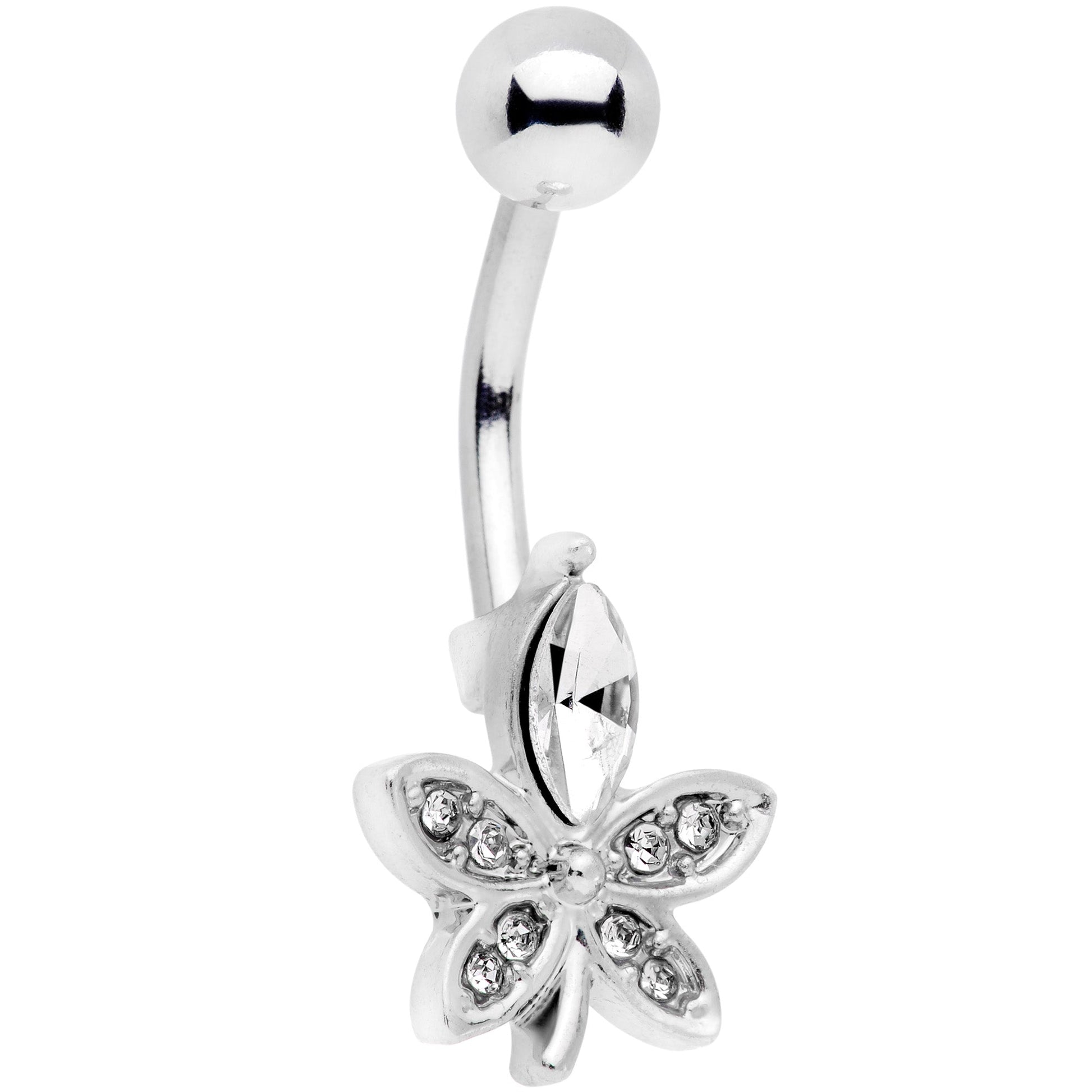 This flower has such a light and breezy look to it, you might almost expect it to float away! This 14 gauge navel ring is made with a 316L surgical grade stainless steel curved barbell with a 5mm top ball end. The bottom end features a flower charm with four of its five petals paved in small clear gems and the top petal set with a single clear gem. Let flowers flourish in your navel with this fanciful belly button ring!