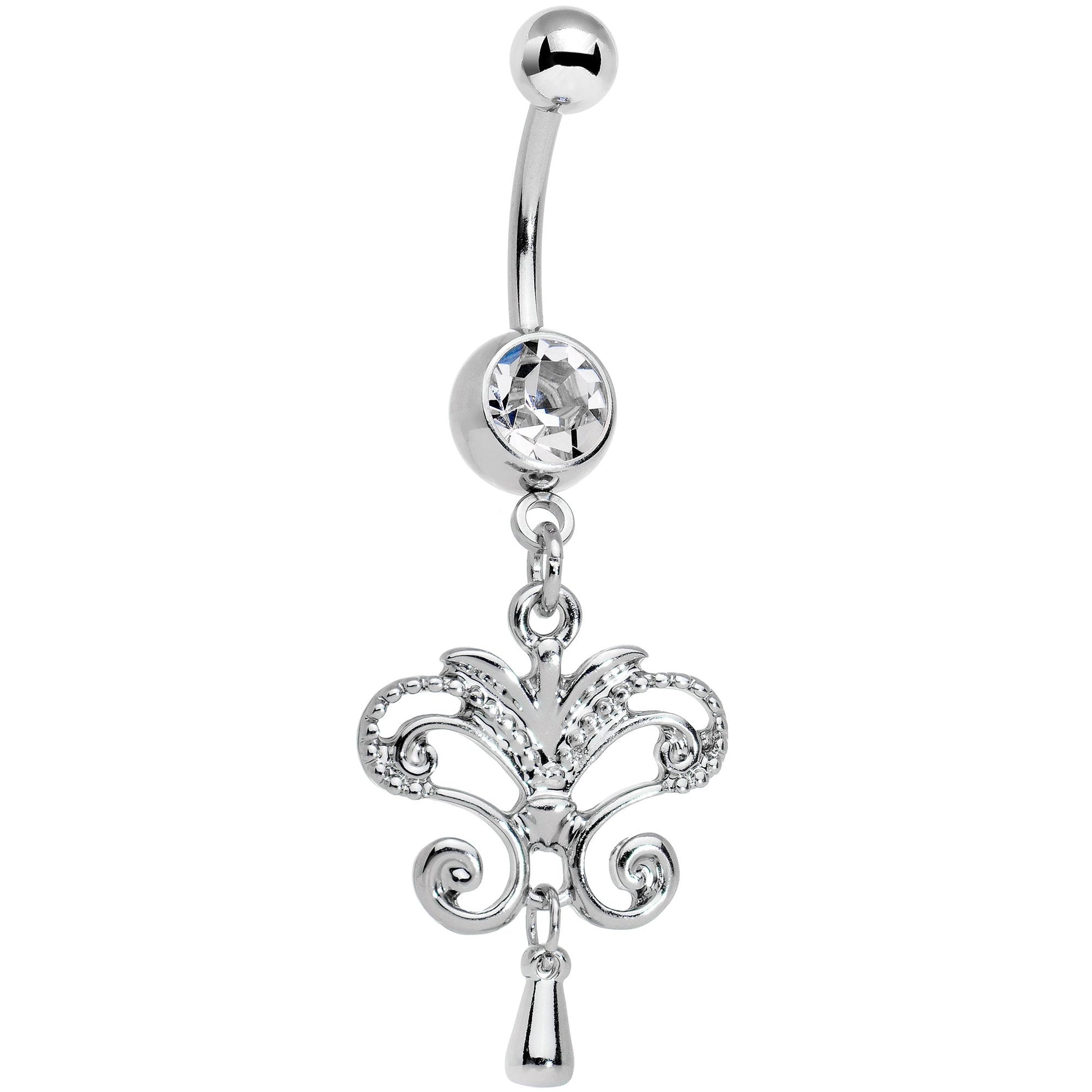 This double dangle chandelier belly button ring feels like it could hang from the ceiling of a Hollywood mansion, but it'll actually hang right from your navel piercing. The stylish looking chandelier dangle features a second dangle metalwork mini-pendant under its main filigree metalwork chandelier design. The chandelier dangles from a 14 gauge, 7/16" curved barbell made with durable 316L surgical grade stainless steel and comes complete with a clear gem.