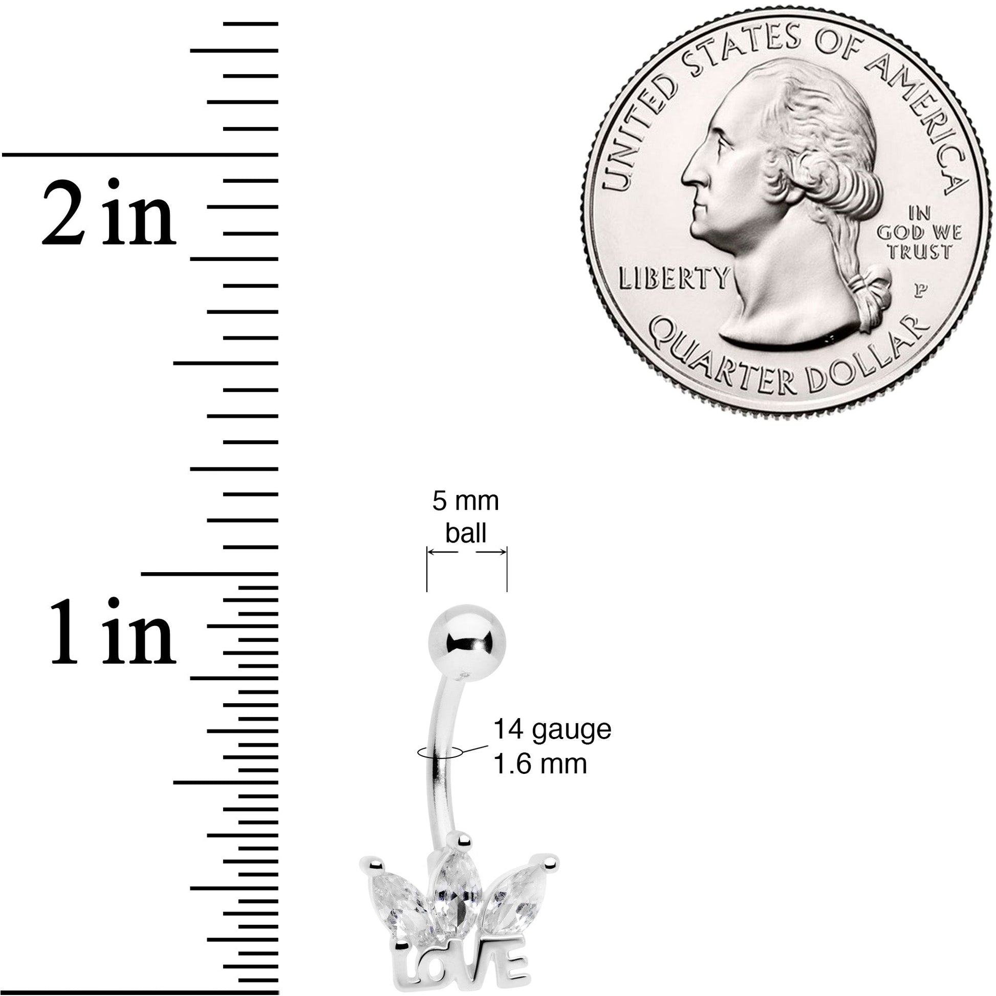 Show the world that love is king...or queen...with this 14 gauge navel jewelry! It's made with a 7/16" durable 316L surgical grade stainless steel curved barbell with a 5mm top ball end. The bottom end features a trio of clear gems fanned out over the word "love" like a royal crown. Spread love whether it's Valentine's Day or not when you wear love with this elegant and timely belly button ring.Specifications
