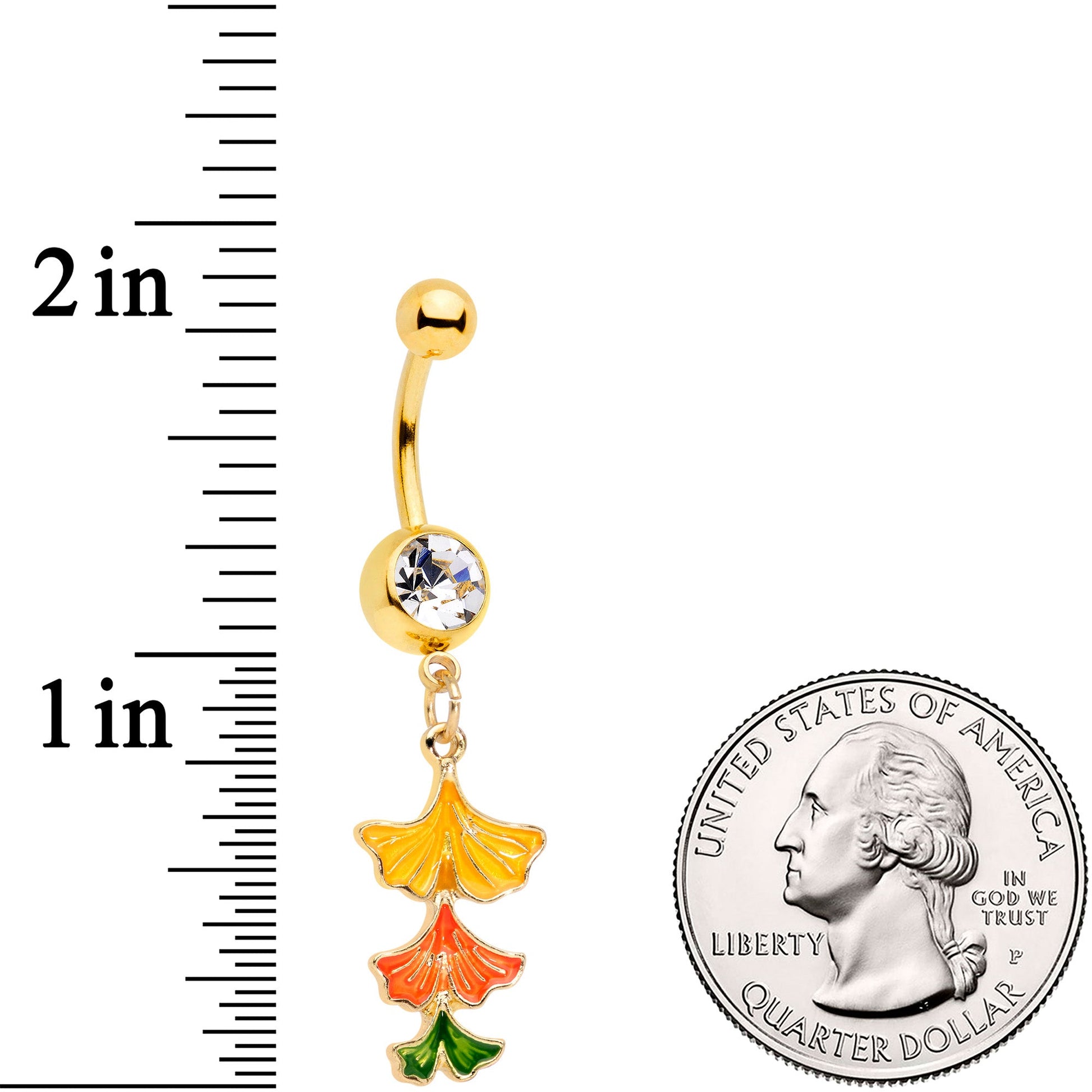 You're totally going to fall for this 14 gauge navel ring! It's made with a 3/8" gold tone PVD over 316L surgical grade stainless steel curved barbell with a 5mm top ball end. The bottom ball end is 8mm and set with a large clear gem. Dangling beneath it is a charm of three abstract forms, inspired by the falling leaves. They're yellow, orange, and green and set in descending size order for maximum visual impact. This autumn, grab some navel piercing jewelry that you're sure to fall in love with!Specifications