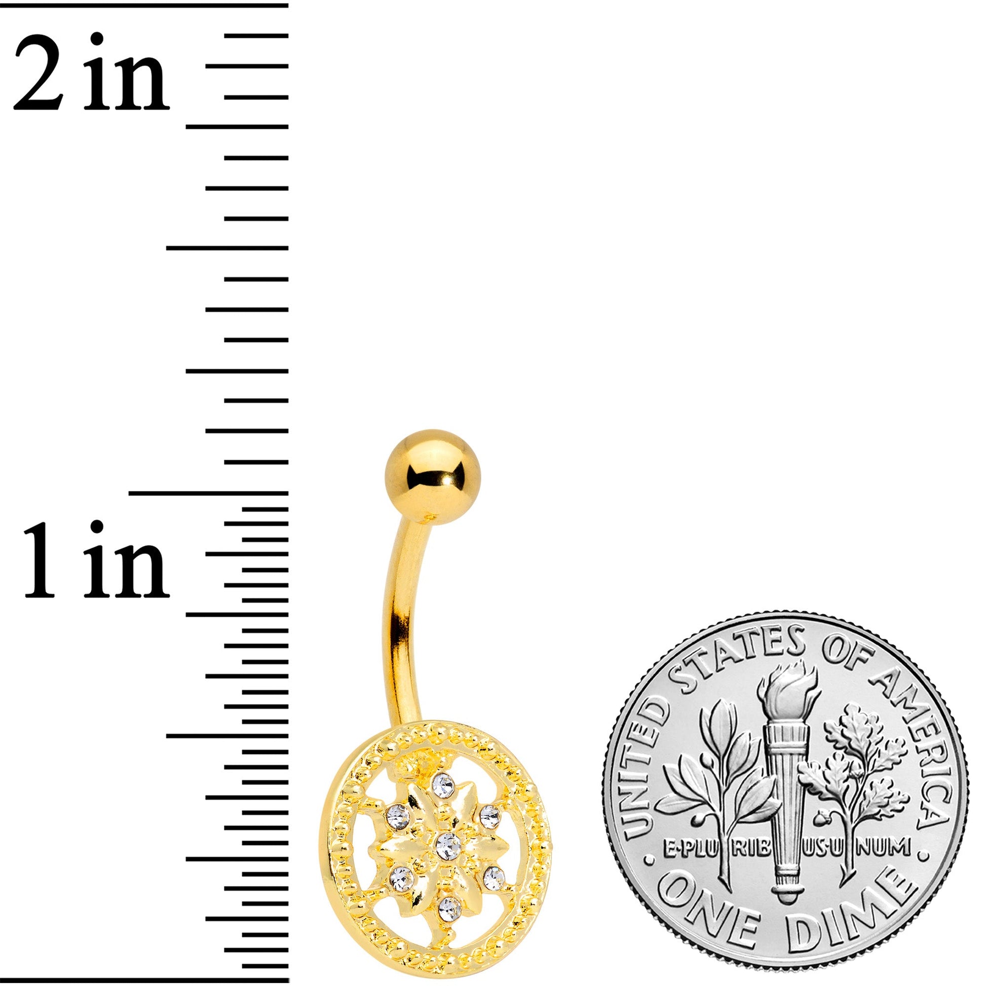 Flowers are always lovely but the flower on this 14 gauge navel ring is both fine and refined! It's made with a 7/16" gold tone anodized over 316L surgical grade stainless steel curved barbell with a 5mm top ball end. The bottom end features this elaborately detailed flower charm embellished with small clear gems around the edges and at its center. The flower is set within a textured ring, giving it the look of an antique royal seal. Let this fabulous flower stamp your navel piercing with royal style with this fantastic floral belly jewelry!Specifications