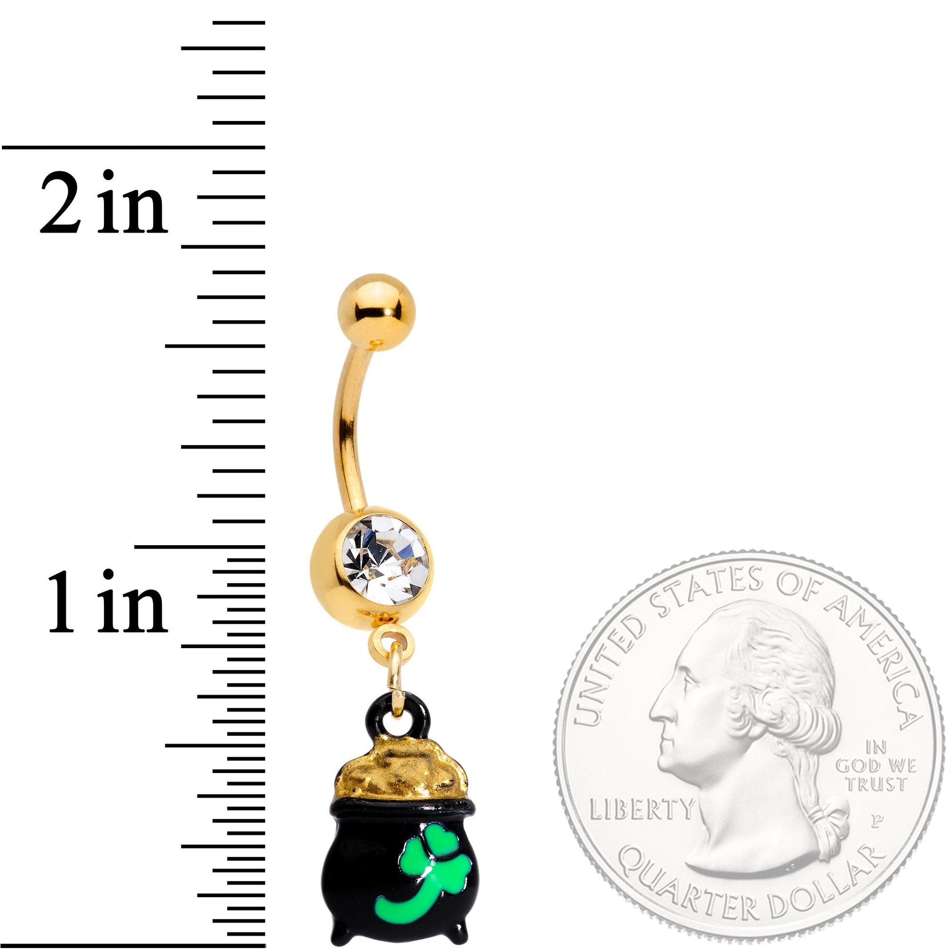 They say there's a pot of gold at the end of the rainbow but who has time to go see when it's simpler to wear this 14 gauge navel ring? It's made with a 7/16" gold tone anodized over 316L surgical grade stainless steel curved barbell with a 5mm top ball end. The bottom ball end is 8mm and set with a large clear gem. Dangling from the bottom is a charm of a black cauldron, emblazoned with a green shamrock. The cauldron is piled high with what appears to be gold-color coins, just like the leprechauns promised! Just in time for Saint Patrick's days, let the leprechauns lead you to your own lucky find - the pot of gold at the end of this belly button ring!Specifications