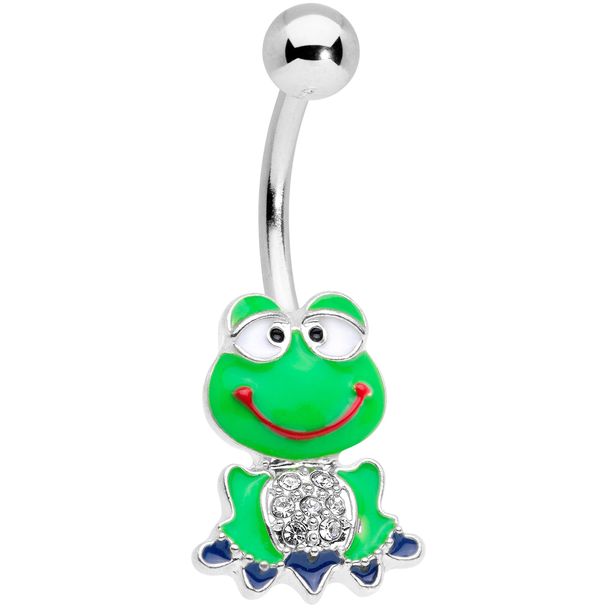 This frog is so happy to be in your navel piercing that he's absolutely goofy with glee! This 14 gauge navel ring is made with a 3/8" durable 316L surgical grade stainless steel curved barbell with a 5mm top ball end. The bottom end features a whimsical green frog charm with clear gems. It's wearing a big silly smile and features black detailing on its toes for some extra color. Let this funny frog belly button ring add some capricious color to your belly piercing!Specifications