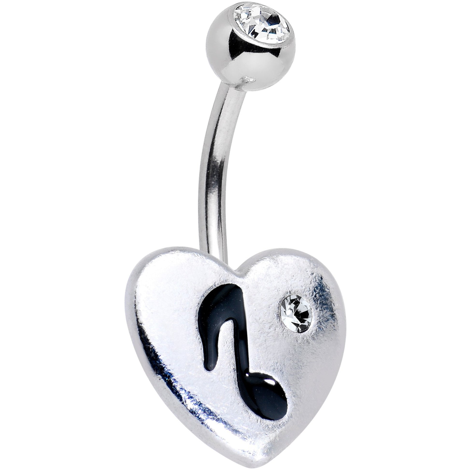 If music of all kinds is your jam, then this fun navel ring is just for you! This 14 gauge belly button ring features a heart-shaped charm end with a black music note and mini clear gem. The heart charm is mounted on a 7/16" curved barbell made with durable 316L surgical grade stainless steel complete with top clear gem inlay. Hear the music in your heart with this cute navel piercing!Specifications