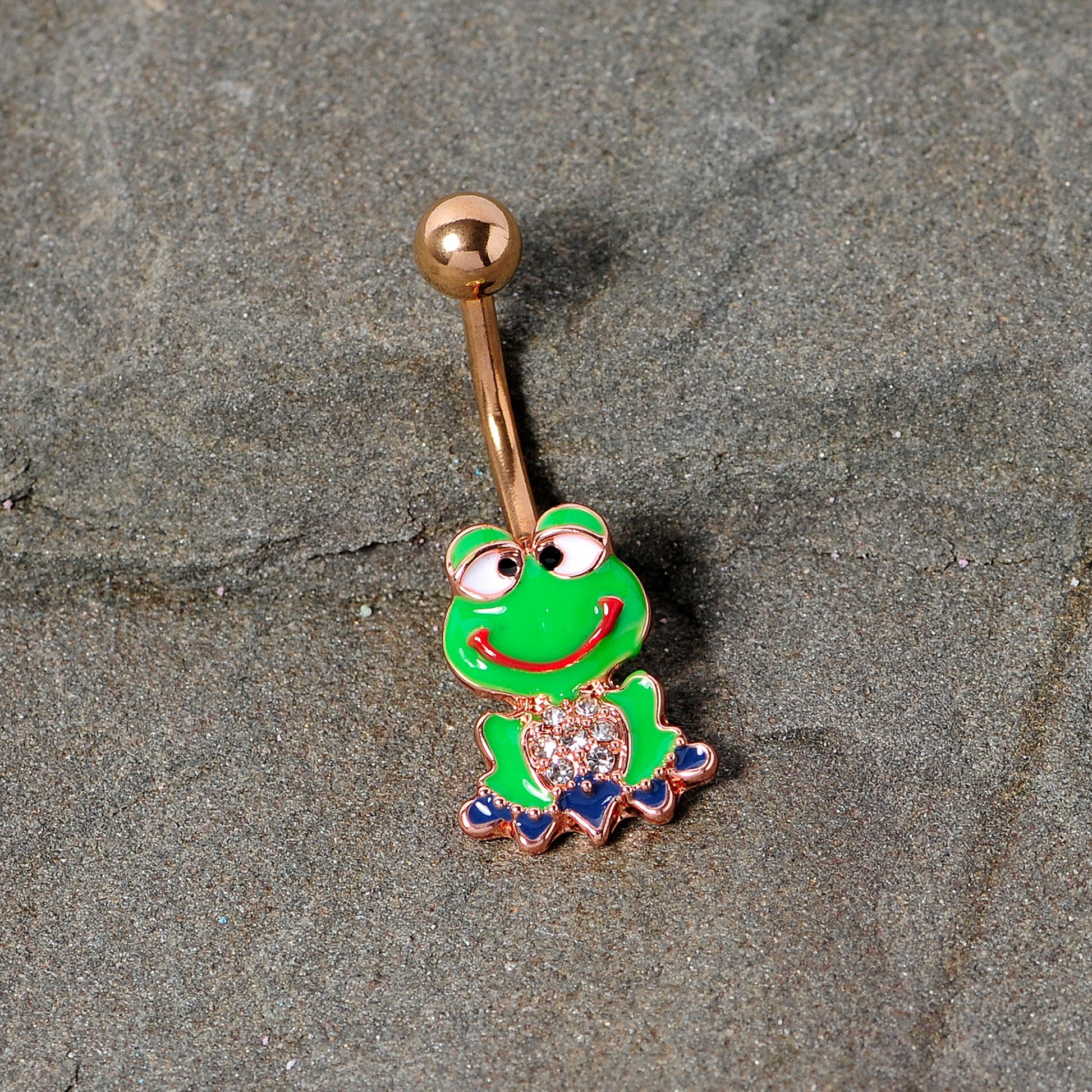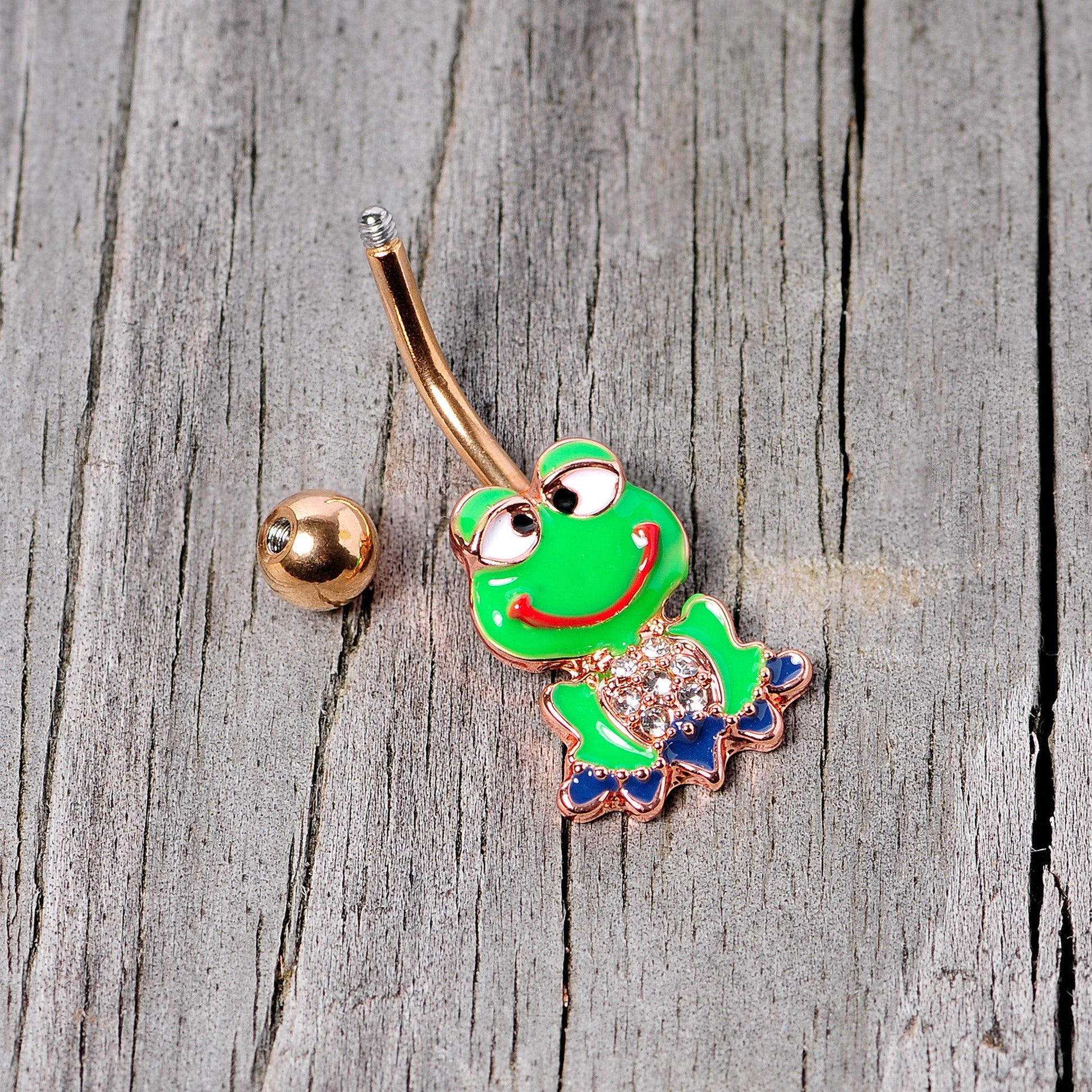 This frog is so happy to be in your navel piercing that he's absolutely goofy with glee! This 14 gauge navel ring is made with a 3/8" rose gold tone plated over 316L surgical grade stainless steel curved barbell with a 5mm top ball end. The bottom end features a whimsical green frog charm with clear gems. It's wearing a big silly smile and features black detailing on its toes for some extra color. Let this funny frog belly button ring add some capricious color to your belly piercing!Specifications