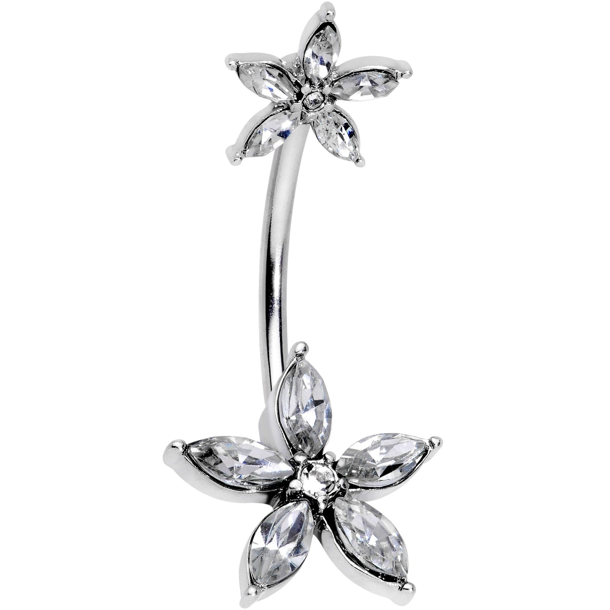 The flowers on this 14 gauge navel ring will make your belly button piercing a star! It's made with a 3/8" durable 316L surgical grade stainless steel curved barbell. The bottom end is a flower charm with cats-eye shaped petals that are reminiscent of a star's rays, and each petal is a single clear gem. There's another clear gem at the flower's center for a cohesive appearance. The top end features an identical flower charm so you can wear it on the top or bottom as you see fit! This elegant flower belly jewelry will have you seeing stars!Specifications