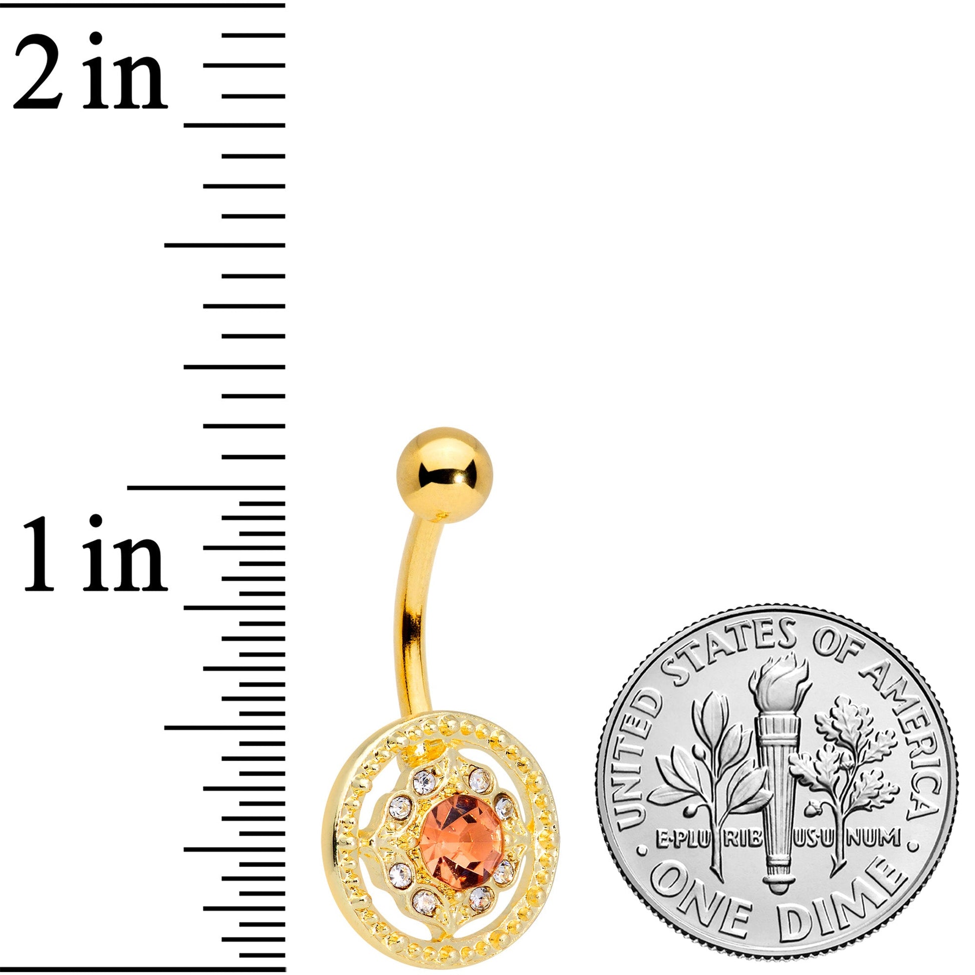 This 14 gauge retro-styled navel jewelry runs rings around the rest with its elegantly antiquated appearance. It's made with a 7/16" gold tone anodized over 316L surgical grade stainless steel curved barbell with a 5mm top ball end. The bottom end features a ring of clear gems. Set in the center of the ring is a large pink gem, faceted to catch the light as well as every eye around! And the whole piece is enclosed in a textured gold-tone circle for a look that's cohesive and aristocratic. This regally retro belly button ring is sure to make your navel piercing feel like royalty!Specifications