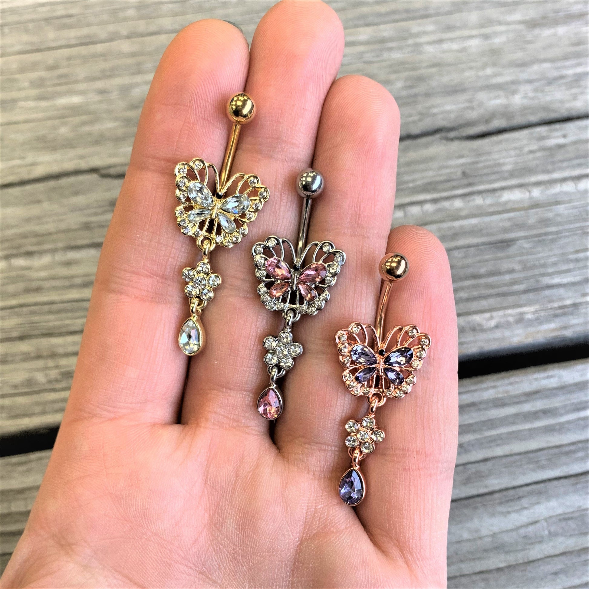 This butterfly is something you're sure to love with its lacy appearance and graceful drop dangle! It's made with a 3/8" durable 316L surgical grade stainless steel curved barbell with a 5mm top ball end. The bottom end is a lacy, openwork style butterfly charm embellished heavily with clear and pink gems. Dangling beneath the butterfly is a small flower, composed entirely of small clear gems. The piece is finished up with a pink gem drop dangling below the flower. The contrast of colors and shapes combined with its sumptuous styling make this one seriously eye-catching navel ring!Specifications