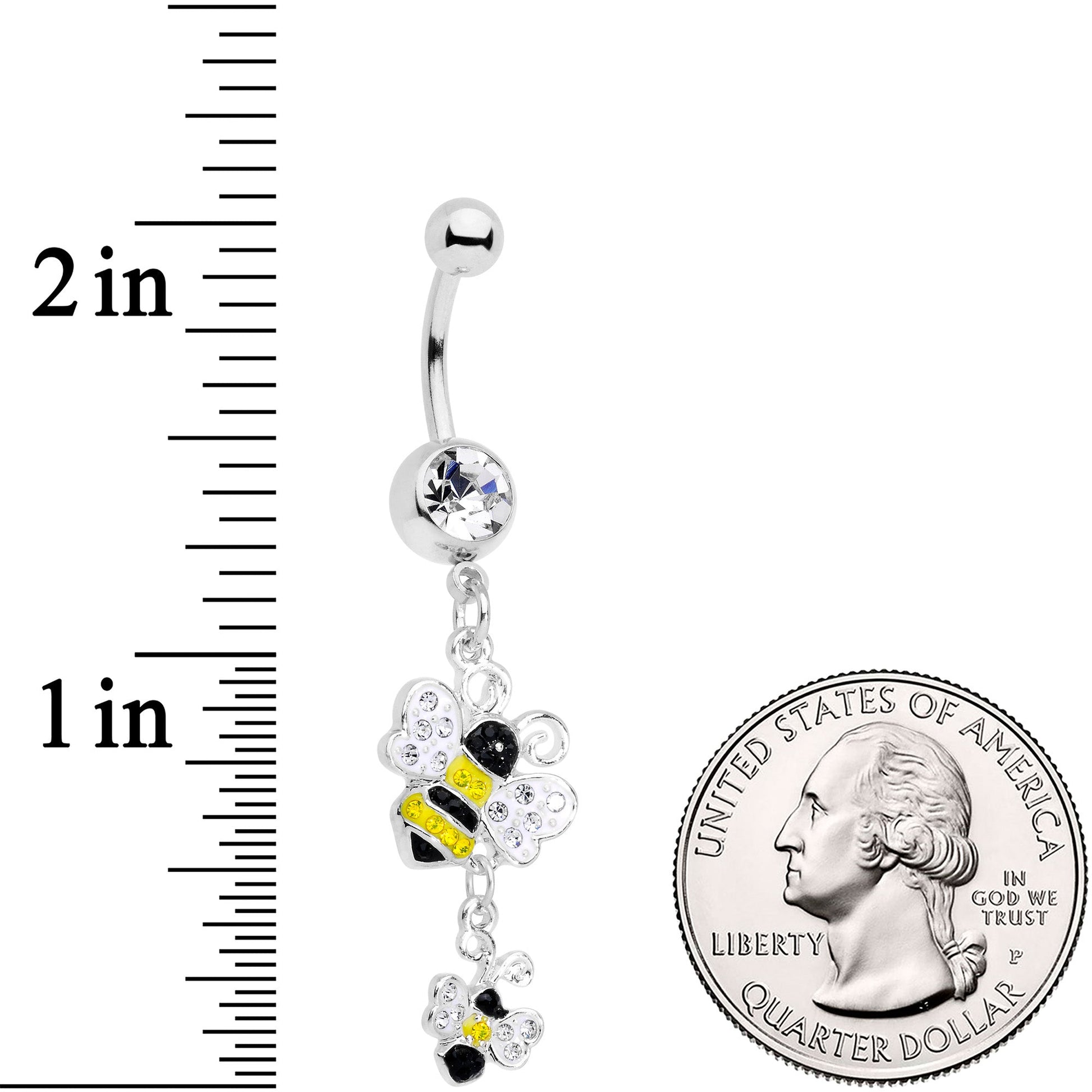 Oh, honey! Your navel piercing is all the buzz with this 14 gauge bee-themed belly button ring in it! It's made with a 3/8" durable 316L surgical grade stainless steel curved barbell with a 5mm top ball end. The bottom ball end is 8mm and is set with a large clear gem. Dangling below it is a bee charm, with whimsically curled antennae and clear gems set into the wings. The bee is further embellished with yellow and black gems set into its head and body for a luxe - yet realistic - appearance. And dangling below the bee is a second, identical bee charm in an endearingly smaller size. Draw a swarm of compliments with this irresistible insect belly button jewelry!Specifications