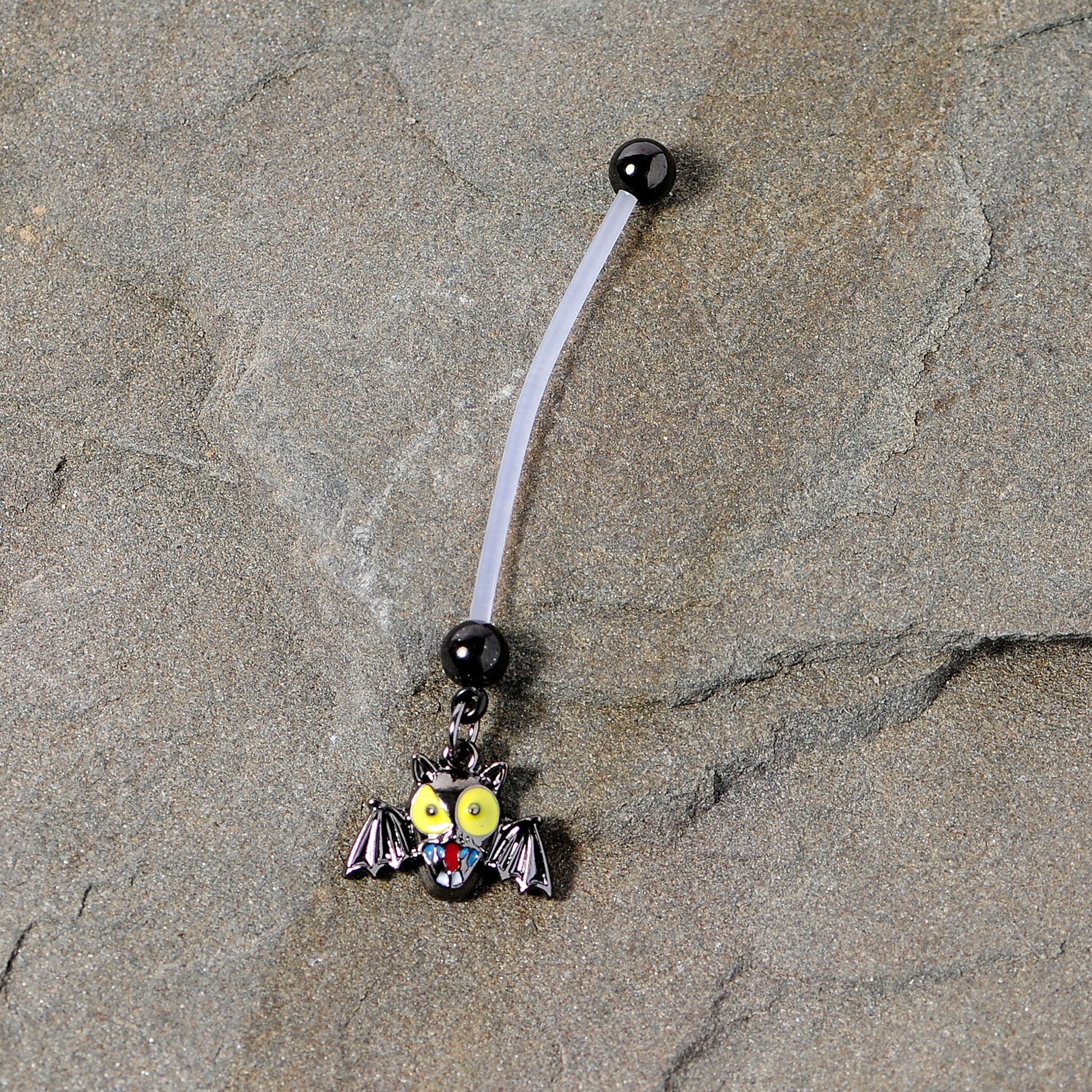 If you don't want to give up your navel piercing now that you're pregnant then you will love this 14 gauge belly button ring that is made for mommy's tummy. Made with a 1 1/2" clear Bioflex straight barbell, this navel jewelry features black PVD over stainless steel ball ends and a scary Halloween bat dangle charm that signifies the bun in your oven! The flexible Bioflex barbell is self-threading and can be trimmed to a perfect fit. Simply cut where needed and reattach the ball end for a fit that's custom to your changing body.Specifications