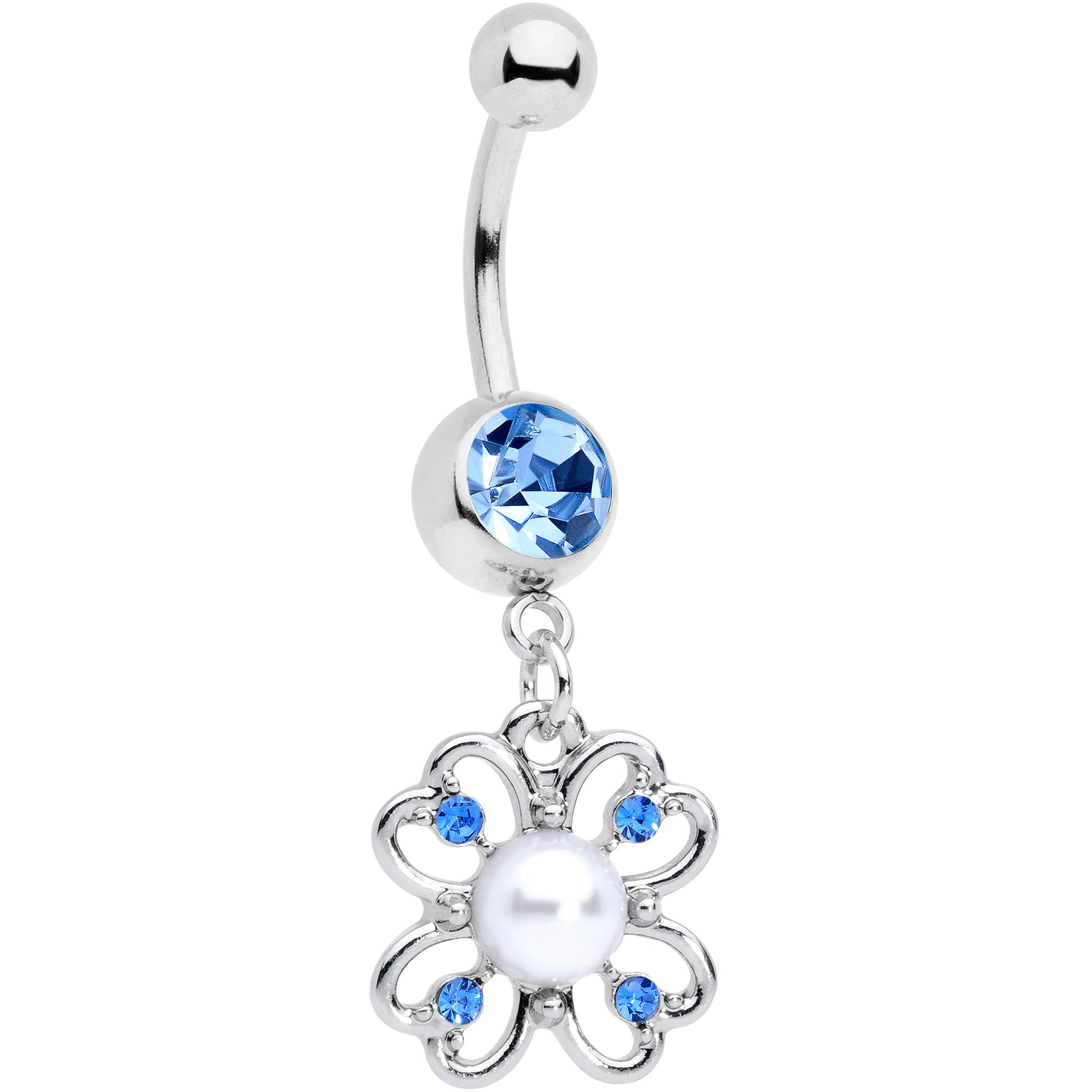 This 14 gauge navel ring features a clover with class! It's made with a 3/8" durable 316L surgical grade stainless steel curved barbell with a 5mm top ball end. The bottom ball end is 8mm and set with a large blue gem. Dangling below it is a bubbled shamrock charm with a small blue gem set into each leaf. At the center is a large white pearlescent orb for an added feel of lavish luxury. If you want to celebrate your Irish heritage and give your navel the poshest piercing around, this clover has you covered!Specifications