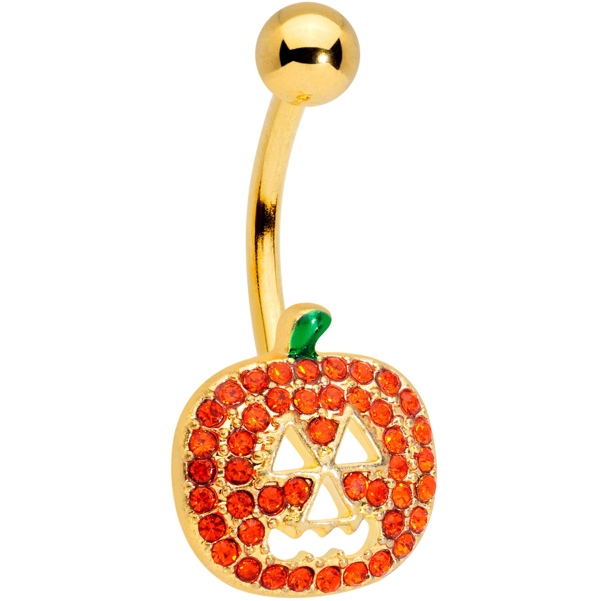 Halloween doesn't have to be just for Fall when you have this 14 gauge navel ring! It's made with a 3/8" gold tone PVD over 316L surgical grade stainless steel curved barbell with a 5mm top ball end. It features a simple-but-stunning jack o' lantern charm paved with small orange gems and featuring a tiny green stem. Perhaps that beauty is the reason why it looks so cheerful? When you have this good-looking Halloween icon in your belly button piercing, you can't help but smileSpecifications