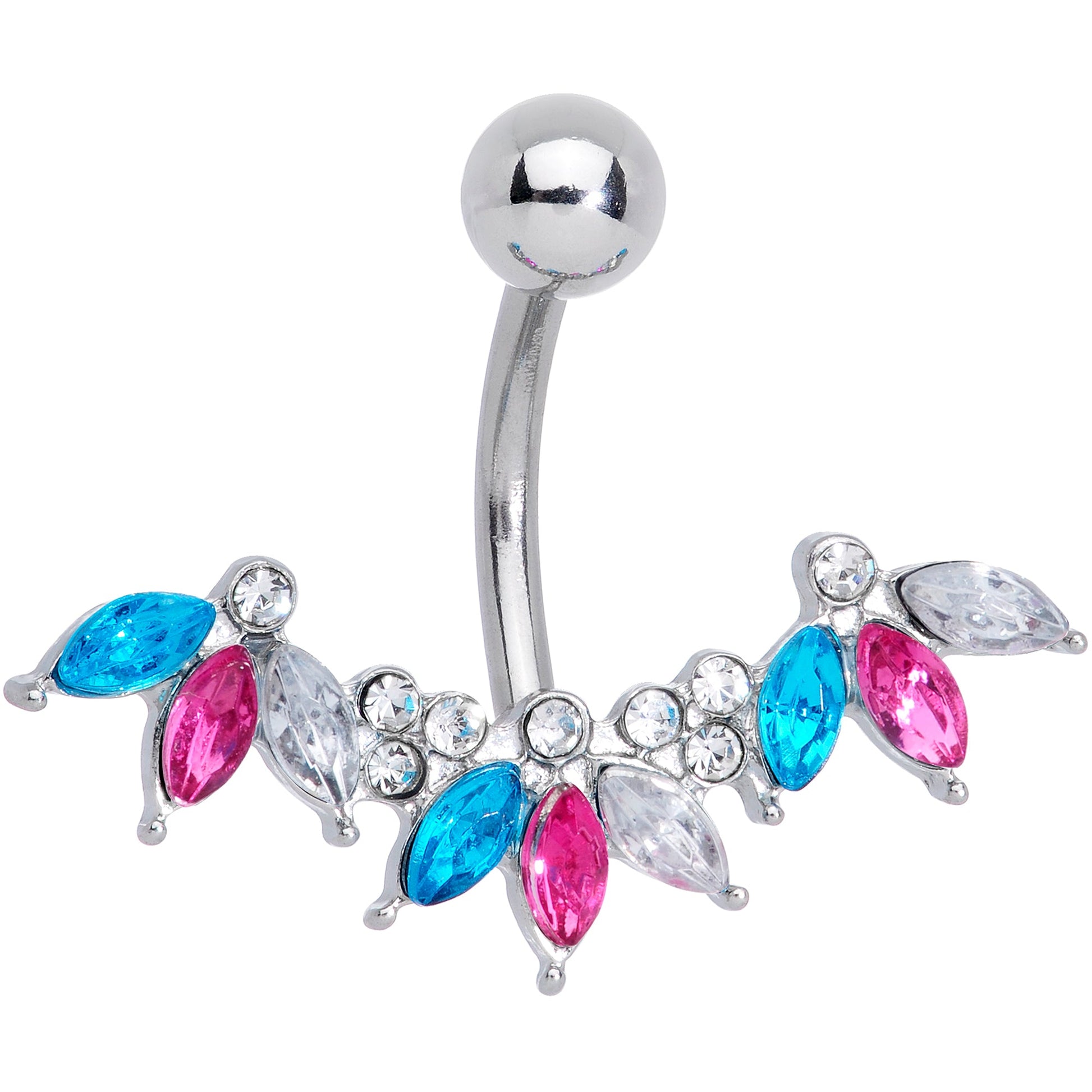 The classical styling and rich colors on this 14 gauge navel ring just scream elegance! It's made with a 3/8" durable 316L surgical grade stainless steel curved barbell with a 5mm top ball end. The bottom end features a curved charm with three gem clusters. The clusters are made up of clear oval gems, matching pink and aqua gems, and embellished with tiny clear gems. Let your belly button piercing look like a work of art with this deliciously dignified navel jewelry.Specifications
