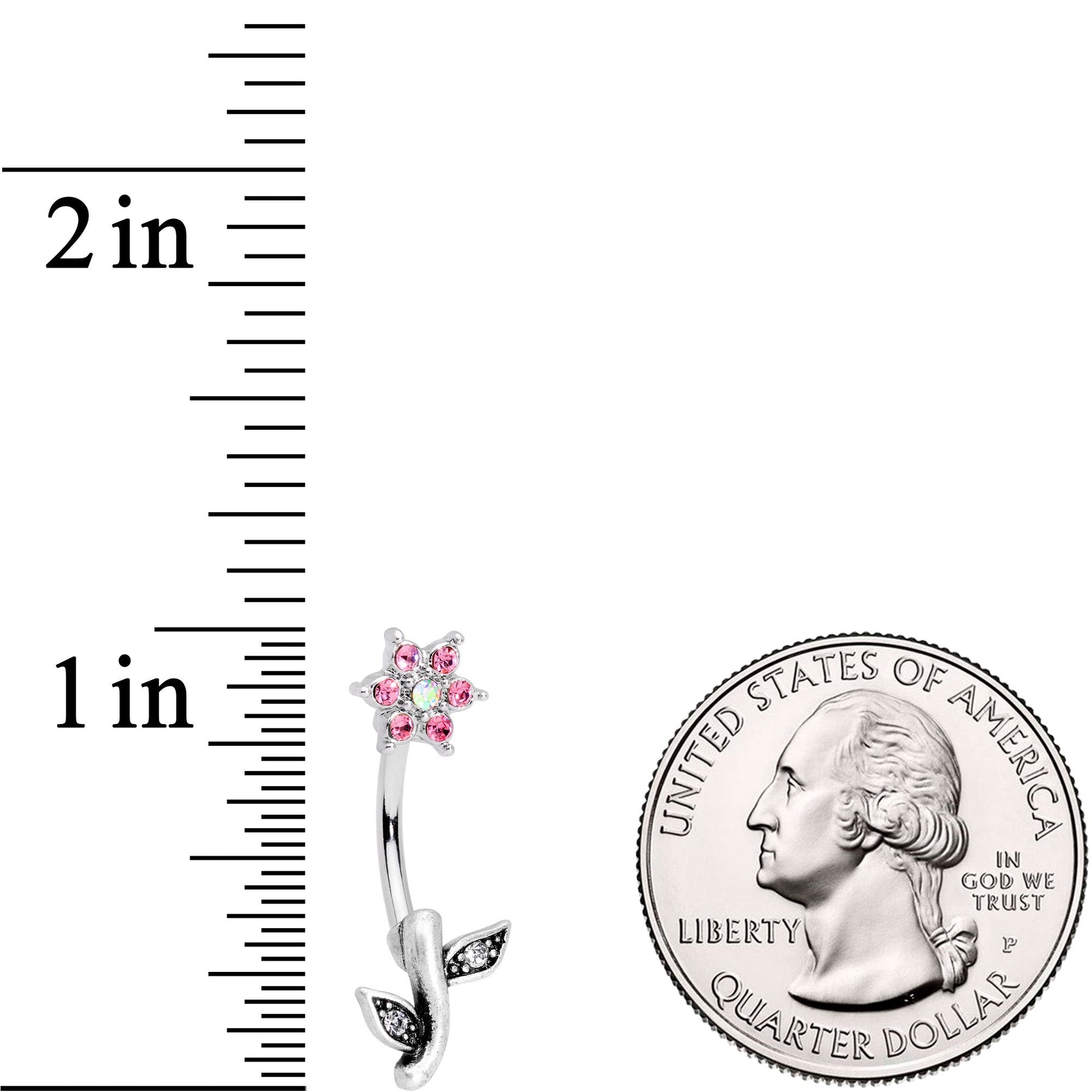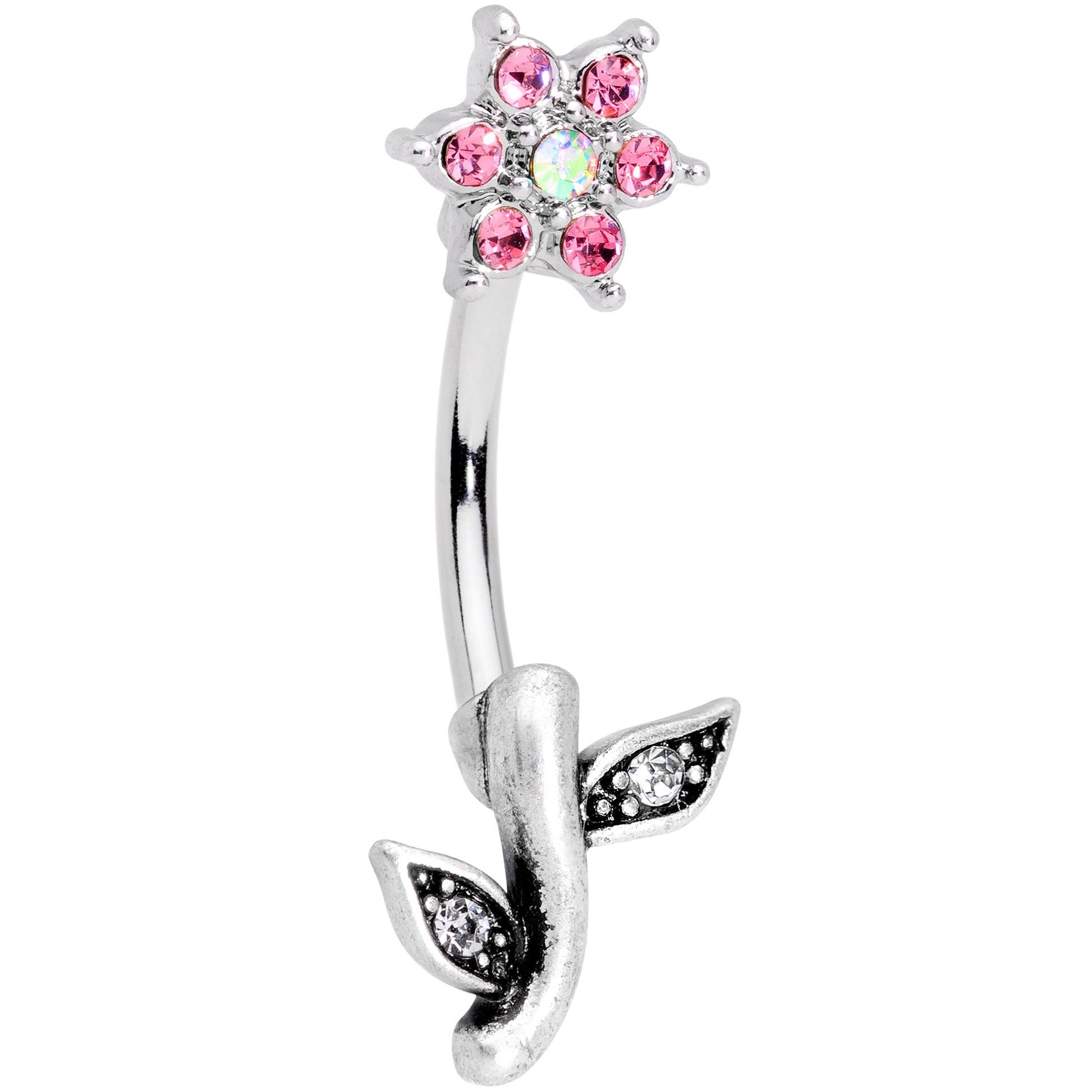 This set of navel jewelry has flower power! Each 14 gauge navel ring is made with a 3/8" durable 316L surgical grade stainless steel curved barbell. You get one that has a plain 5mm top and 8mm bottom ball end for a look that's clean and simple, one with a 5mm top ball end and a pink gem 8mm bottom ball end and one made to look like a single flower, with the blossom picked out in small pink gem and a tiny clear gem at the center. The bottom end is detailed with two leaves, each one set with a matching clear gem. Your belly button will look bloomin' beautiful with this set of navel jewelry! Sold as a set of three.Specifications