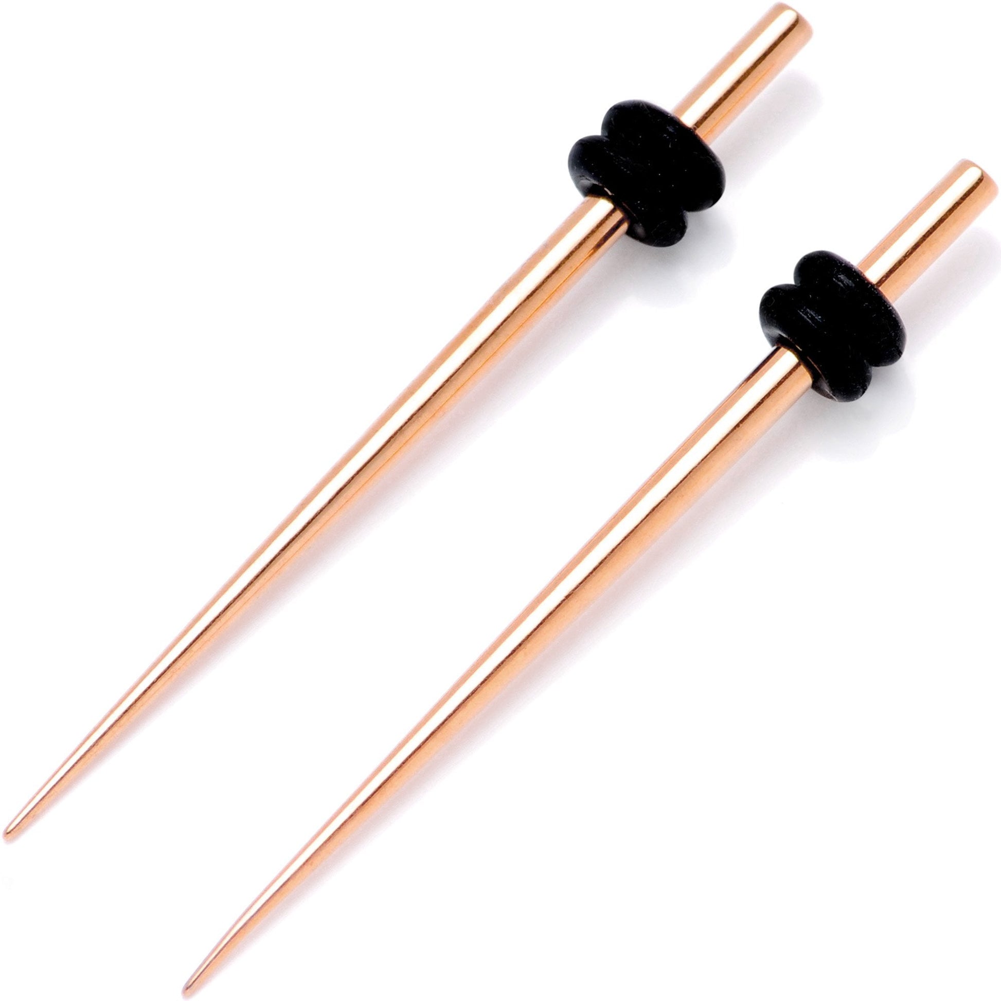 These tapers are as simple and straightforward as they get. These tapered ear gauges are made with rose gold tone anodized titanium over 316L surgical grade stainless steel that is gradually tapered to gently stretch from one gauge size to the next, come with rubber o-rings for secure wear, and are sold as a set of two conveniently for you.