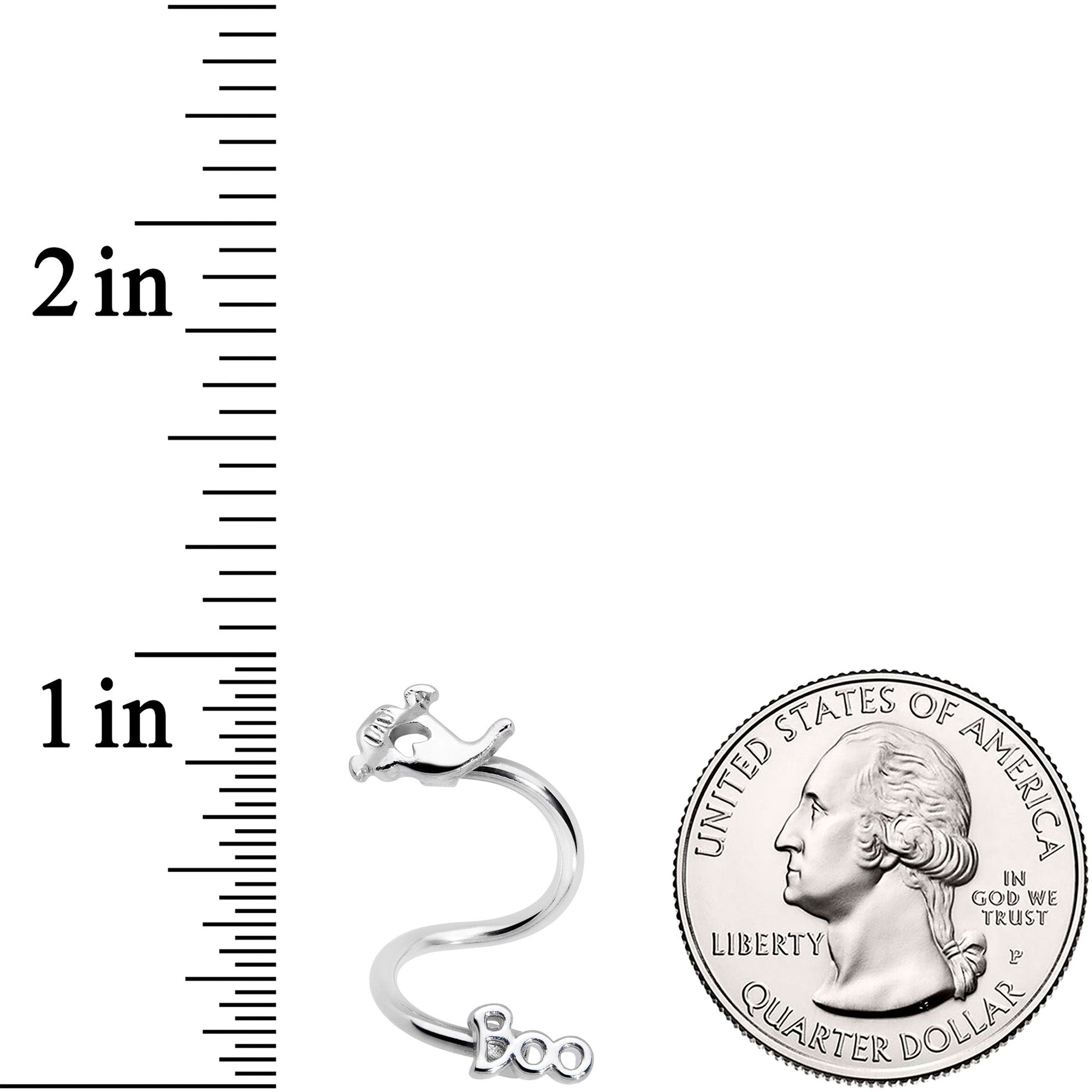The ghost on this 14 gauge navel jewelry has something to say! It's made with a 3/8" durable 316L surgical grade stainless steel spiral curved barbell. One end features a ghost charm, its mouth wide as if wailing in Halloween horror. The other end features the word "BOO" in a stylized font charm that adds tons of creepy impact. You can even rock this ring in multiple piercings including the belly button, lip, some eyebrow piercings, and some cartilage piercings such as the helix. This ghost will give perfectly horrifying Halloween style and tons of options!Specifications