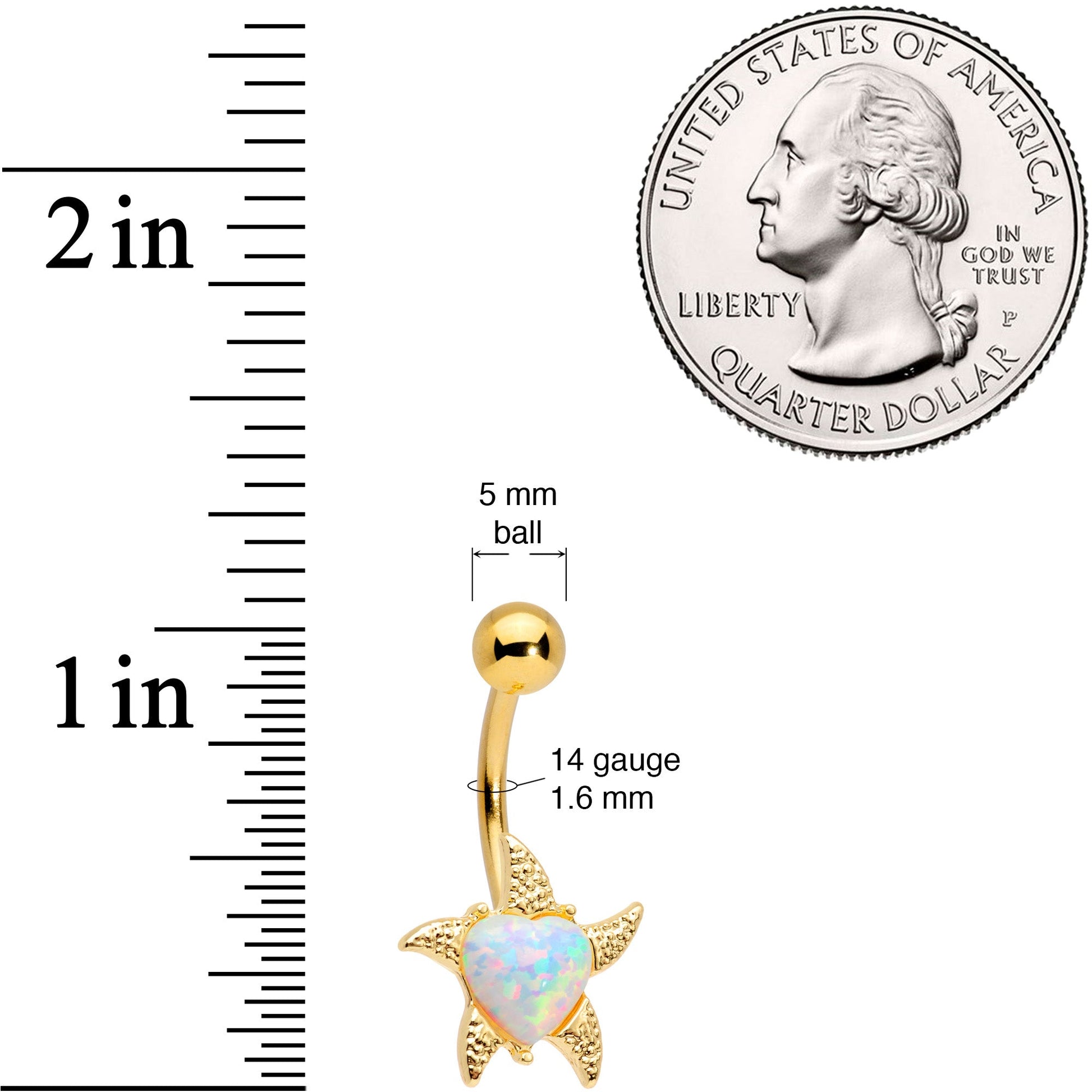 If you've got a soft spot for sea life this nautical navel jewelry will sweep you away like a tidal wave! The 14 gauge belly button ring is made with a 3/8" gold tone plated over 316L surgical grade stainless steel curved barbell with a 5mm top ball end. The bottom end features a starfish charm set at its center with a heart-shaped white synthetic opal. Whether you're bound for the beach or obsessed with the ocean, this is a star you'll want shining in your navel piercing!Specifications